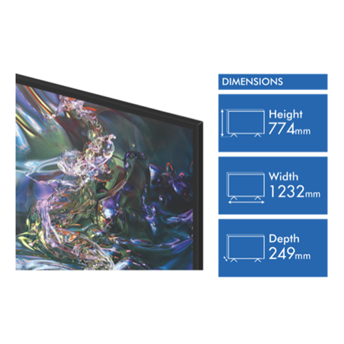 Bring home cinema viewing into your living room with the Samsung 55 Q60D 4K QLED Smart TV. This quantum dot technology powered QLED screen delivers over a billion shades of pure colour for exceptionally vivid images. With four times the resolution of Full HD the 4K Ultra HD display immerses you in your favourite movies shows and games. Powered by a quad-core processor the intuitive Tizen operating system provides quick access to popular streaming apps. Control your smart home devices play games and access apps hands-free with built-in Alexa and Google Assistant. Connect external devices via the three HDMI and two USB ports. Weighing 16.3kg this sleek 55-inch TV enhances any interior with minimal footprint. View content clearly from wide angles courtesy of the dual LED backlight. With a one-year manufacturer's warranty this 6-star energy rated and water efficient Samsung TV promises years of stellar 4K entertainment. The manufacturer's part number for this product is QA55Q60DAWXXY.