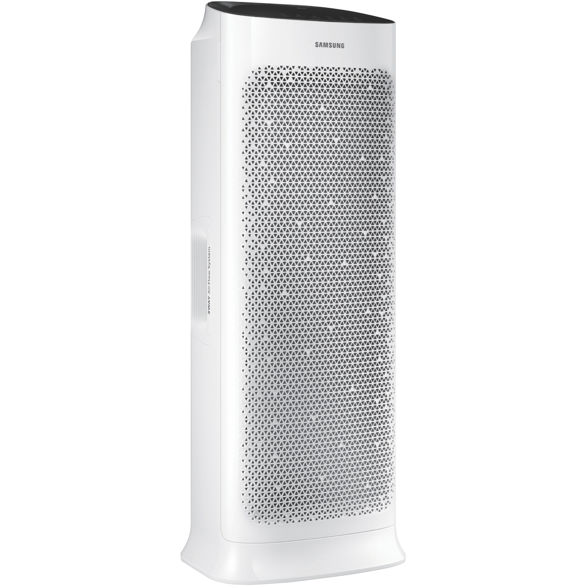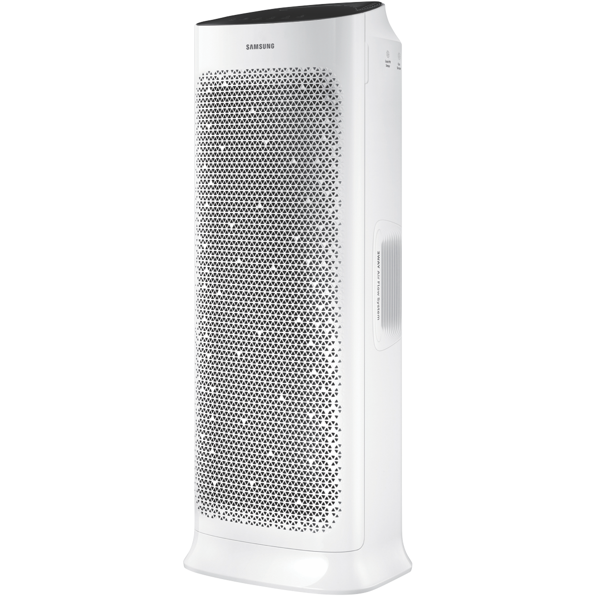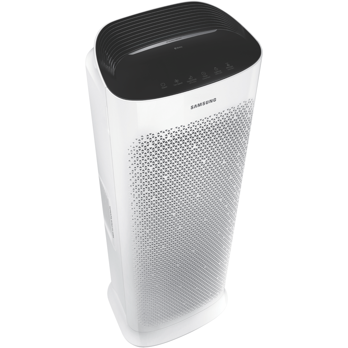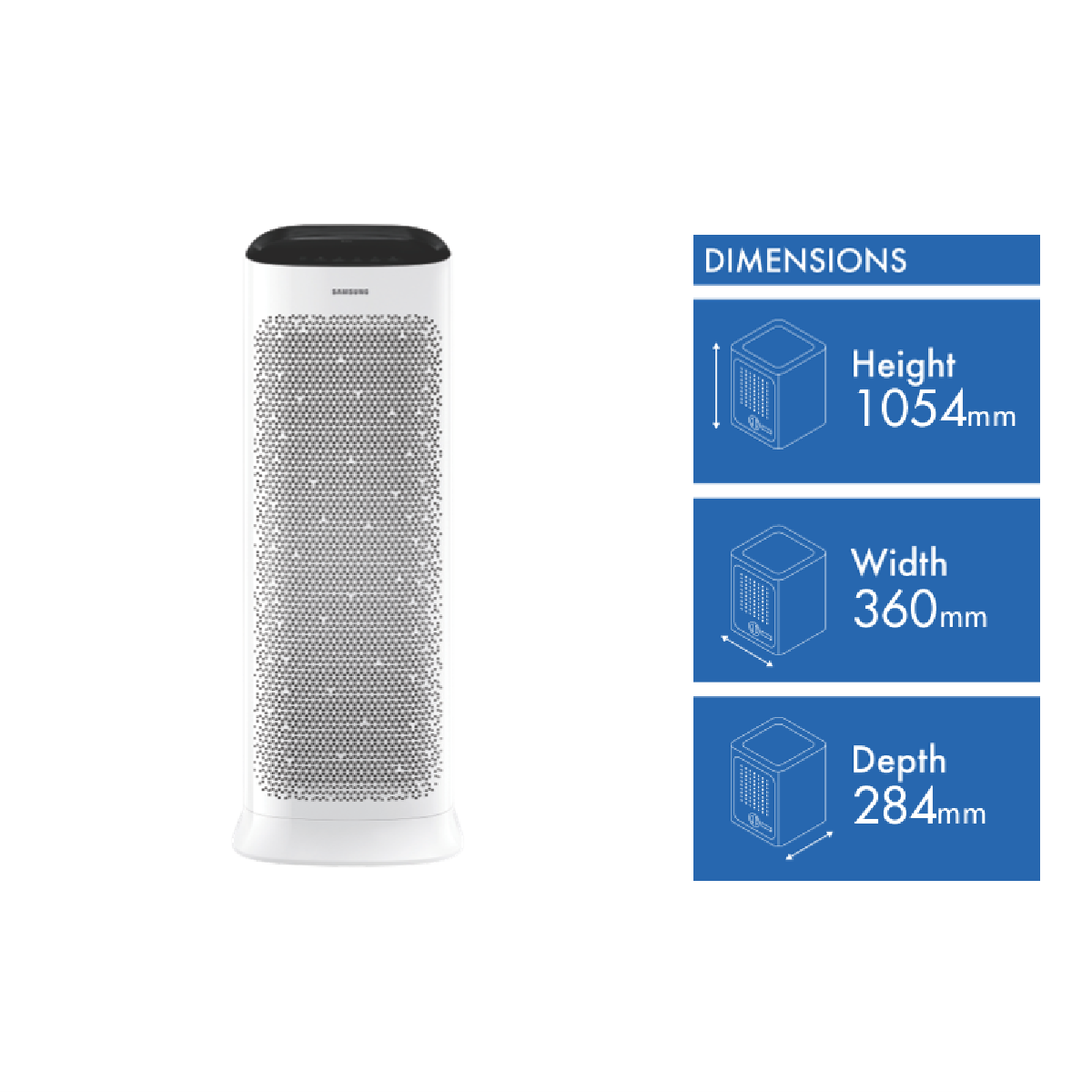 Fill your large open plan living area with fresh clean air with this Samsung Ultimate AirPurifier AX90 with Wi-Fi AX90T7080WD/SA designed to purify fast wide and powerfully in all directions of your 90m2 space with its 701m3/hr Clean Air Delivery Rate(1) backed up by three way airflow and dual fans further circulating and purifying air rapidly. A multi-layered purification system absorbs the irritants and allergens known to cause irritation to the eyes sinuses and breathing - including dust pet dander pollen harmful gases mould bacteria smoke and more; making the air you breathe hygienically clean. The HEPA Filtration captures 99.97% of 0.3um ultra-fine dust and inhibits the spread of captured bacteria(2) and you can clearly see how clean the air is with a 4-colour indicator and numeric display. Plus remotely monitor the air quality and control your Samsung air purifier via the SmartThings app from anywhere(3). It has a filter replacement alarm a whisper-quiet 21dBA night mode and a child lock for safety. (1) CADR greater than 701m3/h. Tested in the KACA (Korea Air Cleaning Association). (2) Tested on the AX40M3040WMD for xylene benzene ethylbenzene styrene & formaldehyde gases. The filter media has over 99.97% dust collection efficiency based on a particle size of 0.2um as specified by 42 CFR part 84. Antibacterial function tested on the filter media of the dust collecting filter. Tested in the National Test Institute of Korea. (3) A Wi-Fi connection and compatible phone is required.