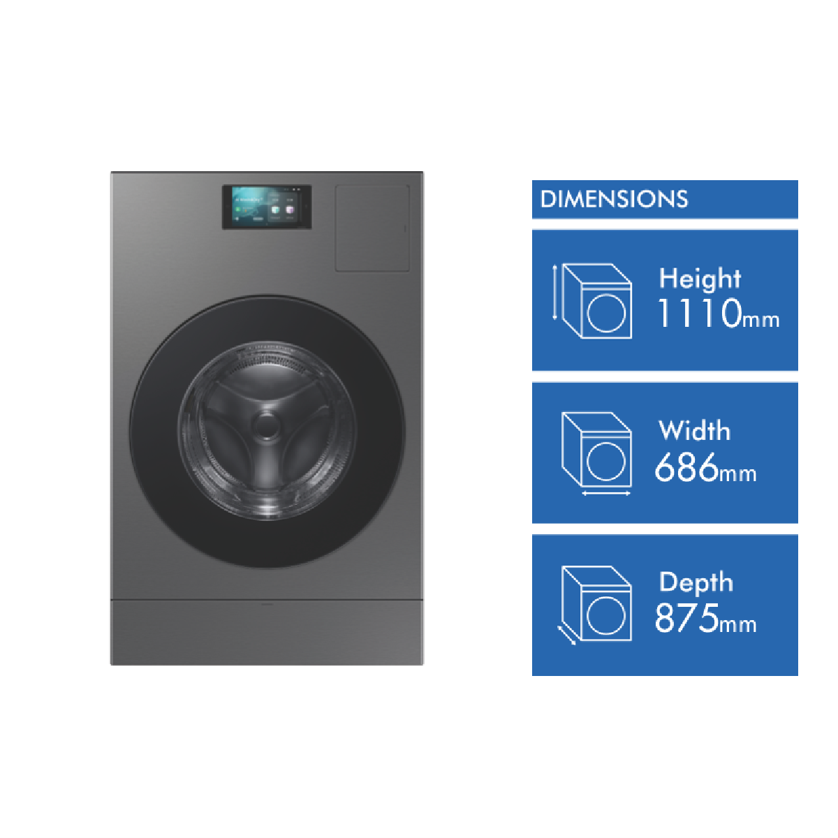 Struggling with your laundry routine? We have the solution. Meet the Samsung Bespoke 18.5kg-10kg AI Heat Pump Combo Washer Dryer (WD18DB8995BZ). This front load washer boasts an impressive 18.5kg washing capacity and a 10kg drying capacity powered by an efficient heat pump dryer. With 20 programs including AI Wash & Dry Air Bedding Care and Pet Care tackling any load is a breeze. The 4 star WELS water rating and 4.5 star wash/10 star dry energy ratings mean savings on your utility bills. Innovative features like Bubble Technology Auto Dosing and the Auto Open Door elevate your laundry experience. The sleek dark silver steel finish adds a touch of style to your home. Backed by a 2 year manufacturer's warranty the Samsung Bespoke WD18DB8995BZ is your trusted laundry companion. Simplify your laundry days with Samsung.