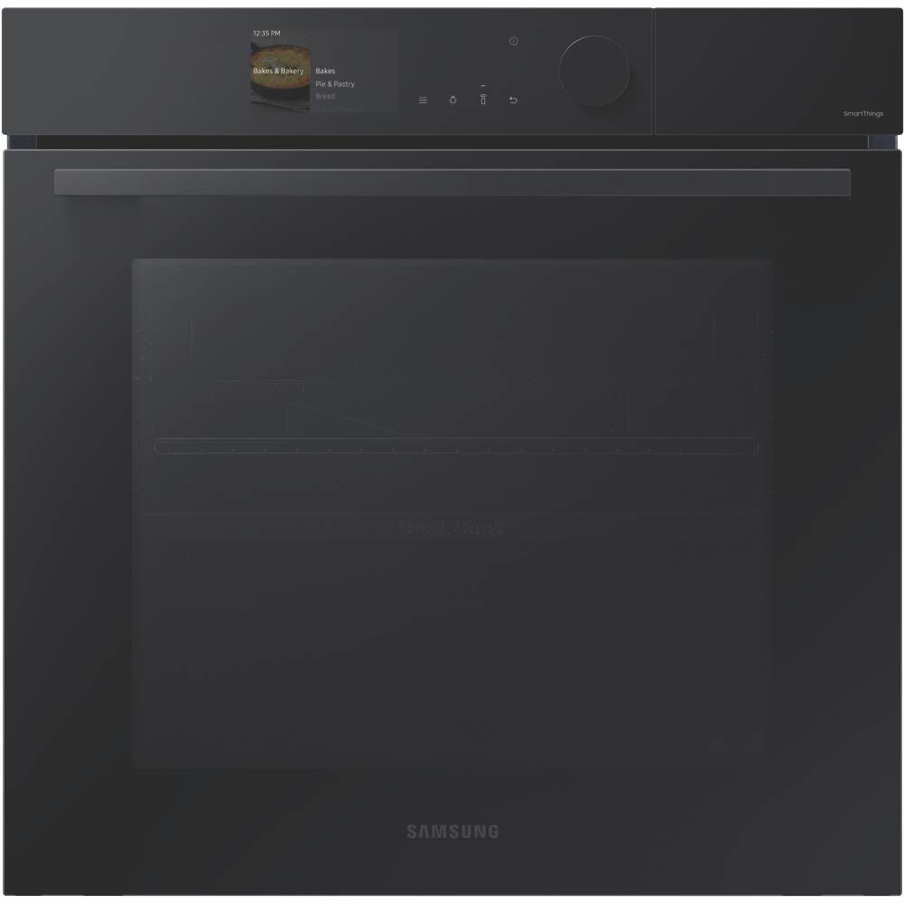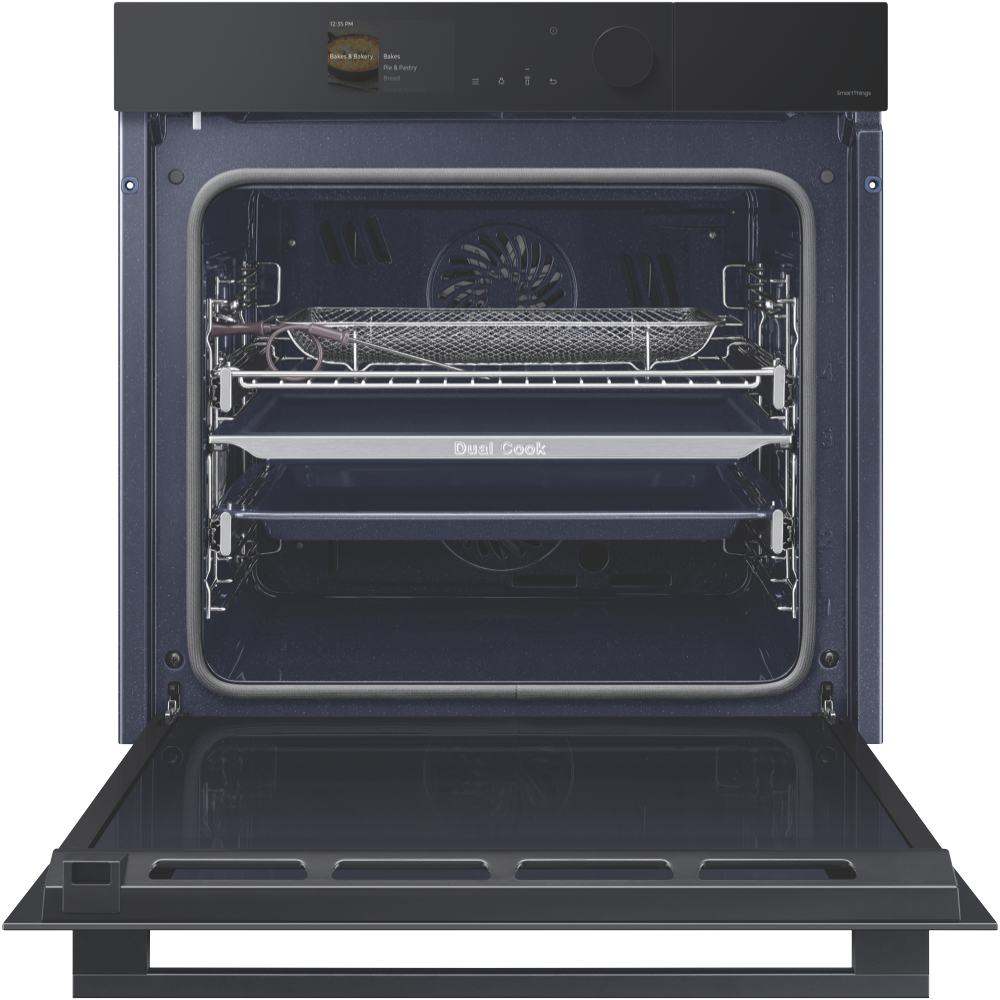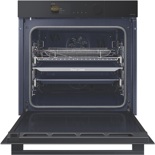 Craft your culinary masterpieces with the sleek Samsung Bespoke 60cm Pyrolytic Oven. This built-in electric oven brings elite cooking performance to your kitchen with innovative Dual Cook and Steam functions that unlock more flavorful dishes. The generous 76L capacity accommodates all your baking roasting and broiling needs. The integrated Air Fry feature lets you cook healthier versions of your fried favorites using little to no oil. Prepare meats and fish to perfection utilizing the integrated food probe that eliminates guesswork by automatically adjusting cook times and temperatures. The intuitive touch and knob controls provide exceptional convenience. Connect the oven to your smartphone through Wi-Fi to control oven settings remotely via the SmartThings app. The brilliant 4.3 LCD display and halogen lights provide outstanding visibility inside the oven cavity. The black glass finish and bespoke design add sophisticated style to your kitchen aesthetic. Enjoy effortless cleaning thanks to the pyrolytic self-cleaning function. With a width of 60cm this multifunctional electric oven simplifies cooking for families or dinner parties. The manufacturer's part number for this product is NV7B6675CAK. Bring gourmet results to your kitchen with the Samsung Bespoke Pyrolytic Oven today.