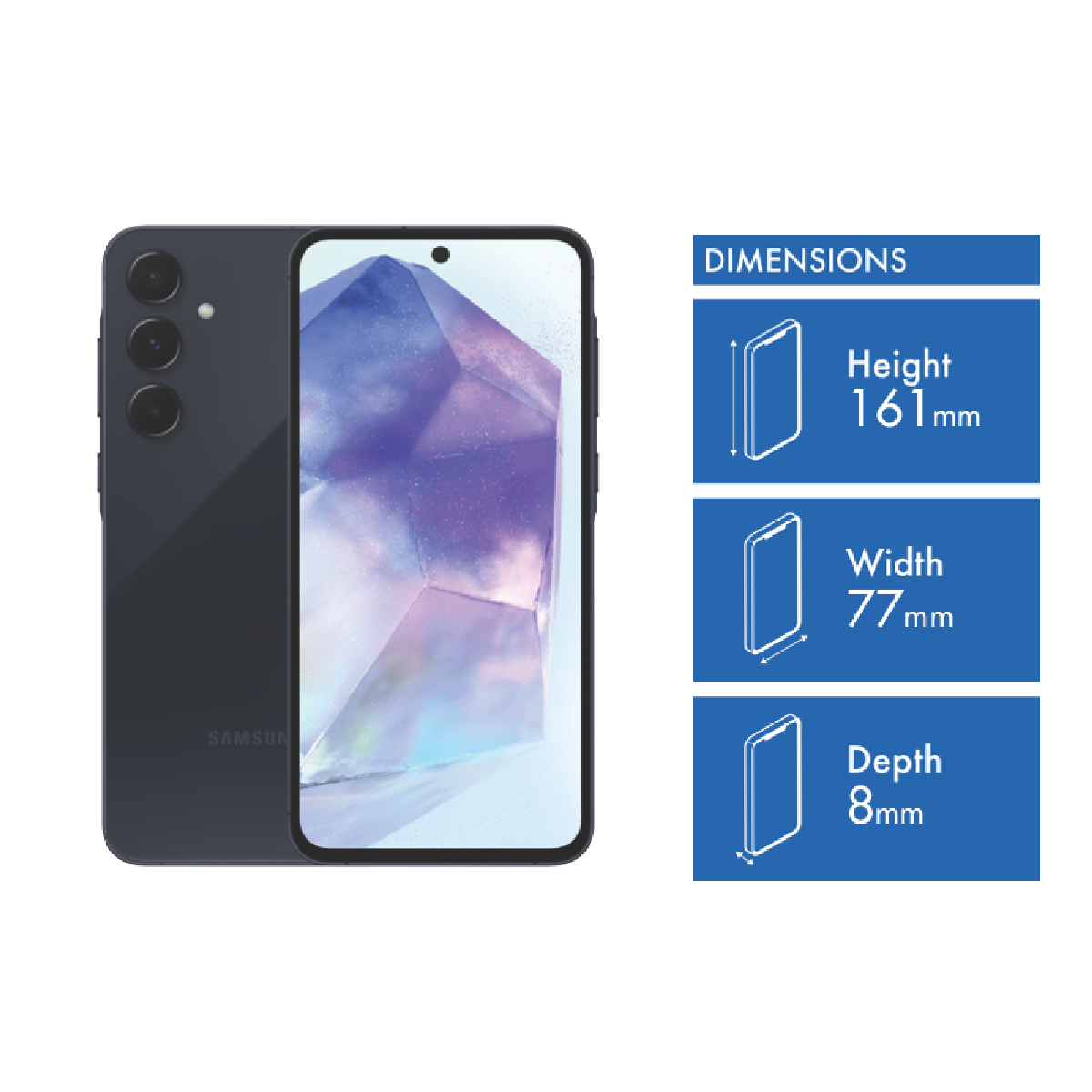 Note: The new Galaxy A55 device does not have a Charger in the box. A min 25W Charger is required. Capture stunning photos and videos with the sleek Samsung Galaxy A55 5G 128GB smartphone in Awesome Navy. Featuring a powerful 50MP rear camera 32MP front camera and 4K video recording this 2024 model lets you shoot high-quality content to share on social media or keep for memories. The brilliant 6.6 FHD+ Infinity-U display provides an immersive viewing experience while the long-lasting 5000mAh battery keeps you connected on the go. With 128GB of storage that's expandable the Galaxy A55 houses plenty of apps photos videos and files. It comes with Android 13 OS and is powered by a speedy Exynos 1480 processor with 8GB RAM for seamless multitasking. Connect via Wi-Fi 6 or 5G networks and Bluetooth 5.3. The IP67 water resistance protects against spills and splashes. Weighing just 213g the Galaxy A55 5G 128GB fits comfortably in one hand. The manufacturer's part number for this product is 11901317174. With a contemporary slim profile in a stunning new colour this is the perfect Android smartphone to keep you productive and entertained all day.