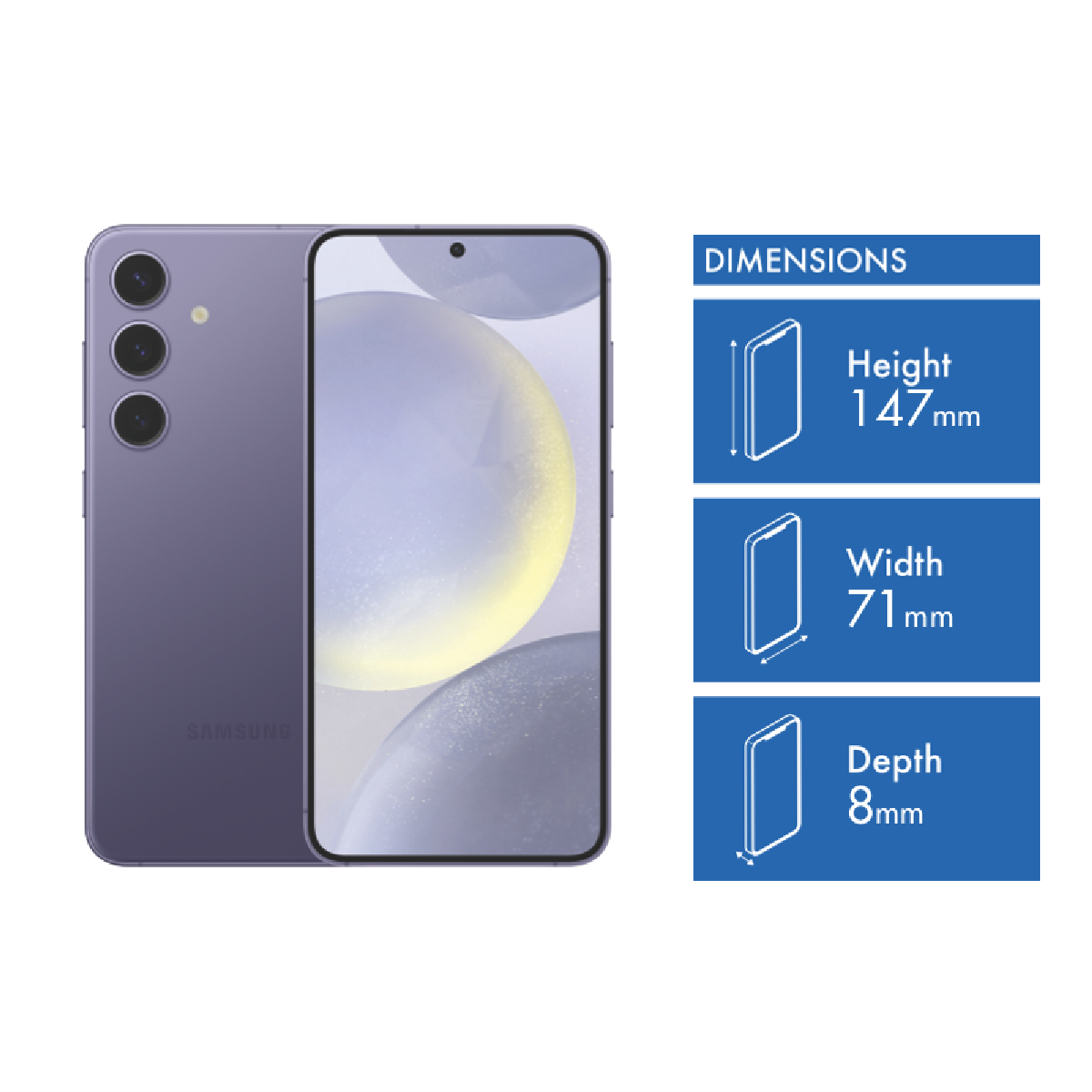 Introducing the Samsung Galaxy S24 Cobalt Violet 11901315517. Leap into a new era of smartphone technology with AI-enabled features(1) including Circle to Search with Google(2) Live Translate Photo Assist and Note Assist. Capture Night and Day moments worth sharing with the Pro Grade 50MP Rear Camera and 3x optical zoom. View everything against an expansive 6.2 FHD+ Display bright enough to stream make video calls and do more for an immersive experience and incredible visibility. Plus never miss a notification with the Always on Display. Feel confident with a seamless design to hold quality and strength in the hand or pocket. Power through with the support of an epic 4000mAh battery helping to stay connected for longer. Circle it search it find it just like that with Circle to Search(2). Explore a new way to search for outfits celebrities or landmarks. Simply circle the object in virtually any image and let this ultimate way of searching provide related content and information. Remove language barriers and experience intuitive communication thanks to Live Translate(3) listen to foreign languages on the other end of the line in your own language and forget about being lost in translation. Experience AI-enabled Photo Assist where every photo is worthy for the feed. Resize retouch and remaster by accessing next-level suggested edits including Object eraser and reflection removal for the perfect shots. Be productive and make long stories short with Note Assist(4). Forget about feeling overwhelmed with information when notes or shopping lists are tabled then summarise points before sharing with colleagues or responding to emails. Disclaimers: (1) AI features may require a Samsung and/or Google Account. (2) Requires Samsung and Google Account and internet connection. Circle to search feature must be enabled. May not work on all images or audio/image elements. Google SafeSearch filter applies. (3) Network connection and Samsung Account required. Currently limited to select languages only. Live Translate feature must be enabled and language package must be downloaded prior to use. Only available on the pre-installed Samsung Phone app. Translation might not be accurate. (4) Samsung Account and Wi-Fi or mobile data required. Feature must be enabled with latest version of Samsung Notes. May not work on all content pasted or written content. The Auto format function has a limit on the number of characters.
