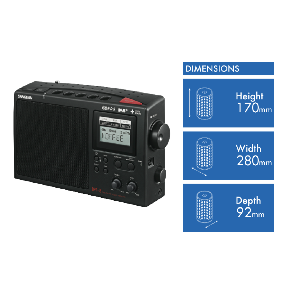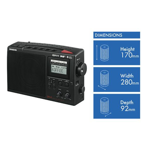 Tune in to crystal clear radio wherever you roam with the Sangean DAB+ AM/FM Portable Radio. This triband digital radio keeps you informed and entertained with access to all your favourite stations in DAB+ AM and FM bands. The easy-to-read LCD display with backlight offers excellent visibility while the high-quality speaker delivers superb sound for all your listening needs. With 10 presets each for DAB+ FM and AM bands you can conveniently save your preferred stations for quick tuning. The dual alarms help you wake up to your favourite radio station or buzzer alarm. Powered by 4 x D batteries or AC power this lightweight radio provides portable enjoyment weighing only 1.62kg. With 1 year warranty from Sangean the DPR45 delivers reliable performance. So bring home the Sangean DAB+ AM/FM Portable Radio and stay connected to your favourite stations on the go.