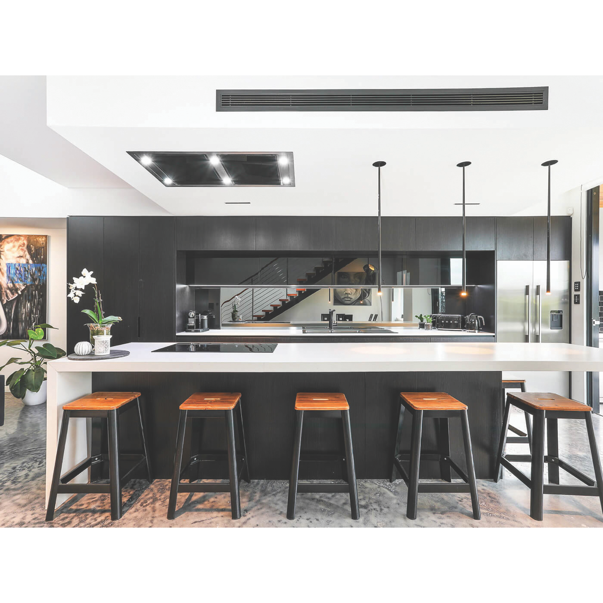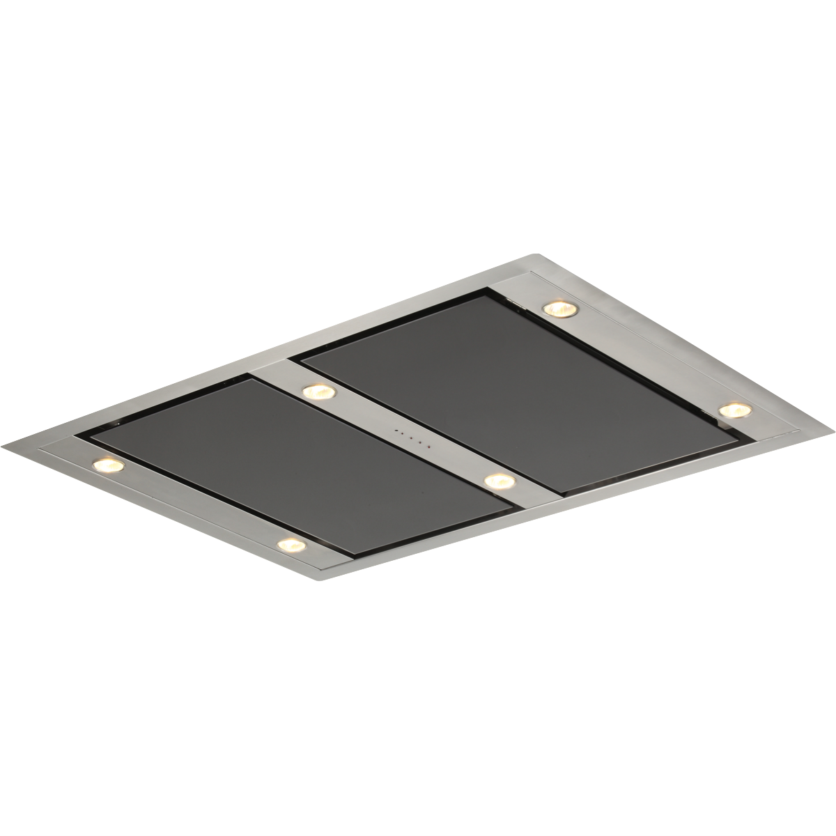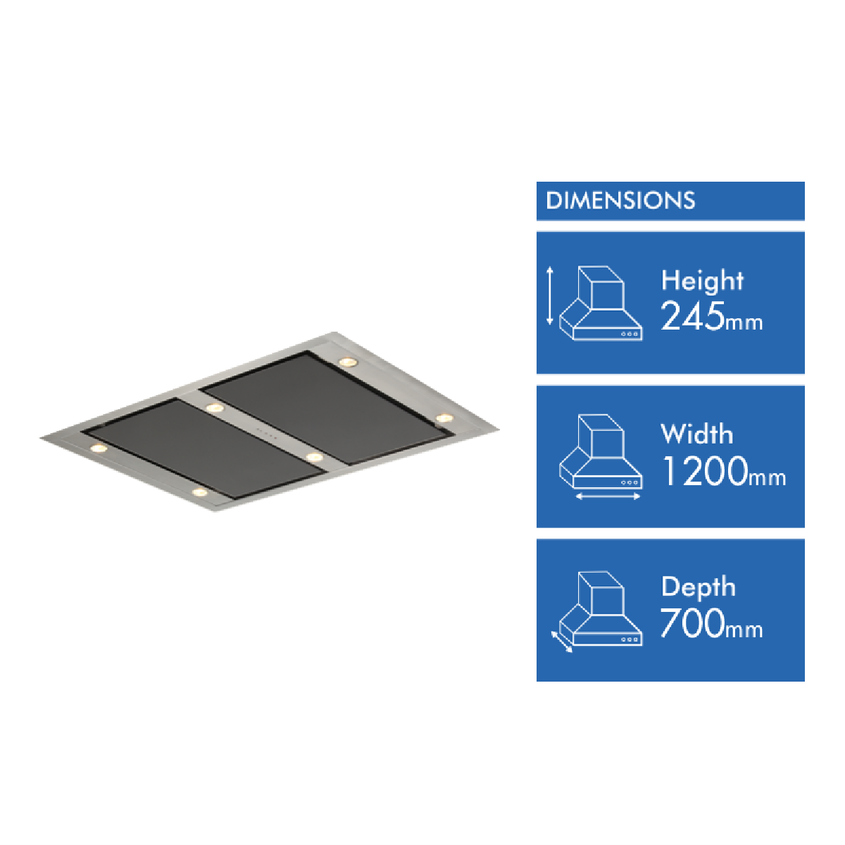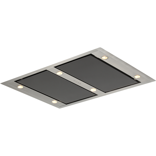 The stainless steel and black glass Schweigen 120cm Silent Ceiling Cassette Rangehood UM422G-12SP2 offers excellent coverage over island or peninsula style kitchen benches in sleek modern styling. You can quietly eliminate smoke and moisture with its 3000 cu m/hr extraction capacity. It has multiple LED lights to illuminate brightly over your creations. With the technology of Perimeter Aspiration airflow is targeted towards the edge of the cassette creating a more intense extraction area. Perfect for maintaining uninterrupted views with its installation flush into the ceiling or bulkhead this Schweigen rangehood accentuates any modern kitchen design.
