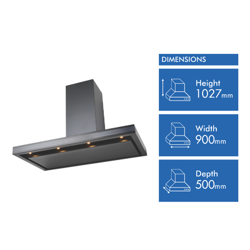 Elevate your kitchen with the sleek modern Schweigen 90cm Canopy Rangehood. This powerful appliance features a striking black stainless steel finish that will complement any decor. With its spacious 900mm width it will handle high volumes of cooking vapors and grease with ease. The Isodrive ST motor and 5 fan speeds quietly move up to 900 cubic meters of air per hour. Four LED lights illuminate your cooktop brilliantly. The soft touch controls and included remote give you precise command of the rangehood. The dishwasher-safe aluminum mesh filters are simple to remove and clean. Ducting is included for ventilation. This rangehood is designed for ducted use to whisk away odors and moisture. Schweigen stands behind the quality of this product with a 3 year warranty. At 1027mm high 898mm wide and 500mm deep this rangehood makes a bold statement over your stove. The manufacturer's part number for this product is DS3326B-9ST. Bring home the Schweigen 90cm Canopy Rangehood and breathe easy while you cook up culinary masterpieces.