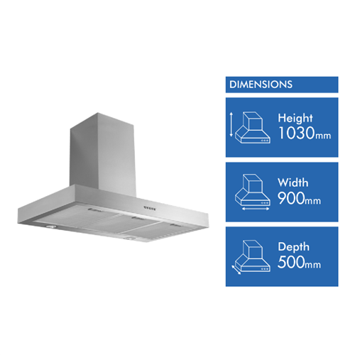 Experience powerful extraction and innovative design with the Schweigen 90cm Non Silent Wallmount Rangehood. This stainless steel wall canopy rangehood efficiently removes cooking odors and smoke with an impressive extraction capacity of 1080m3/hr. The sleek stainless steel fascia seamlessly blends with modern kitchen décor while the single internal motor operates at a noise level of 63 decibels. Easily control the rangehood using the push button controls to adjust between 3 fan speeds. Illuminating your cooktop are 2 bright LED lights. The included 3 mesh filters effectively trap grease and are simple to clean. Measuring 900mm wide 620-1030mm high and 500mm deep this ducted rangehood is suitable for 90cm rangehoods. The manufacturer's part number for this product is TSH-900. Enjoy peace of mind with the 3 year manufacturer's warranty.
