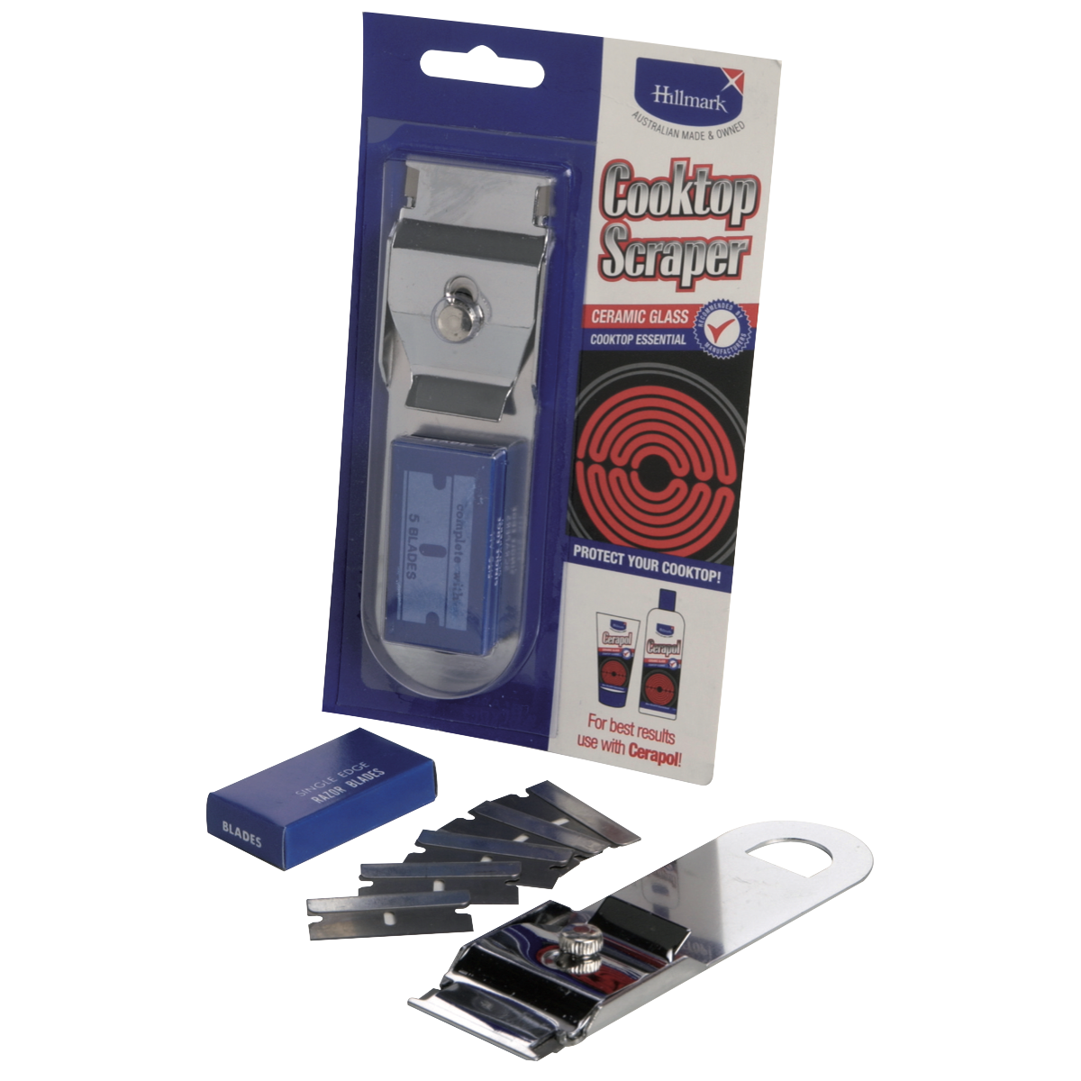 Hillmark Cooktop Scraper is essential for all cooktop owners & is the first step in the Ceramic Glass Care routine. All spills should be removed immediately before they cool. It takes no time at all for food with high sugar to erode your cooktop.