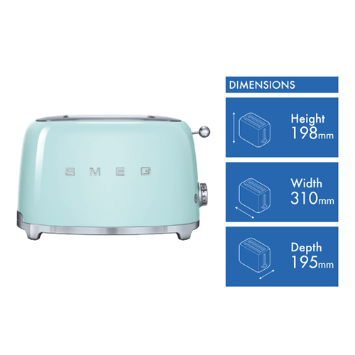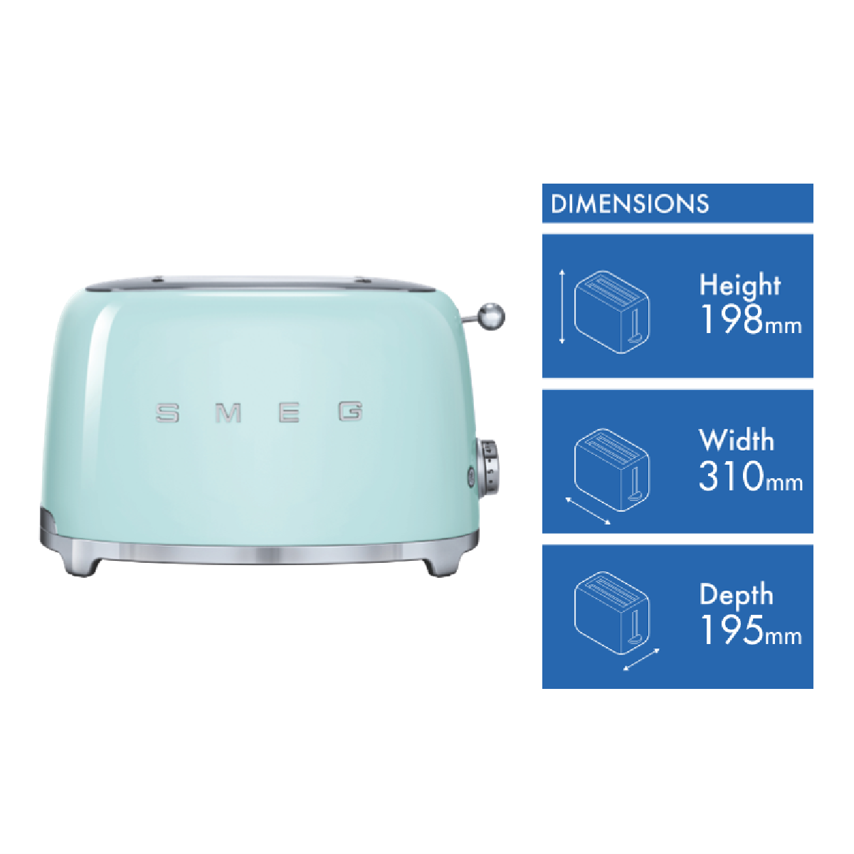 Capture the retro aesthetic in your kitchen with this timeless Smeg 50's Retro Style 2 Slice Toaster TSF01PGAU in pastel green. Featuring the iconic Smeg 1950s silhouette with enamelled-coated stainless steel body and retro logo the award-winning Smeg toaster has six variable toasting levels and three pre-set programs - Defrost Reheat and Bagel - for ideal toasting each time. It features self-centring racks for even browning as well as a removable stainless steel crumb tray for easy cleaning. Get toast browned your way with the browning level adjustment function. It has anti-slip feet and built-in cord storage. Complete with an LED-backlit stylish control knob and stainless steel lever this Smeg retro toaster is the perfect companion to the Smeg 50's Retro Style Kettle for classic statement pieces you'd happily want to be seen.