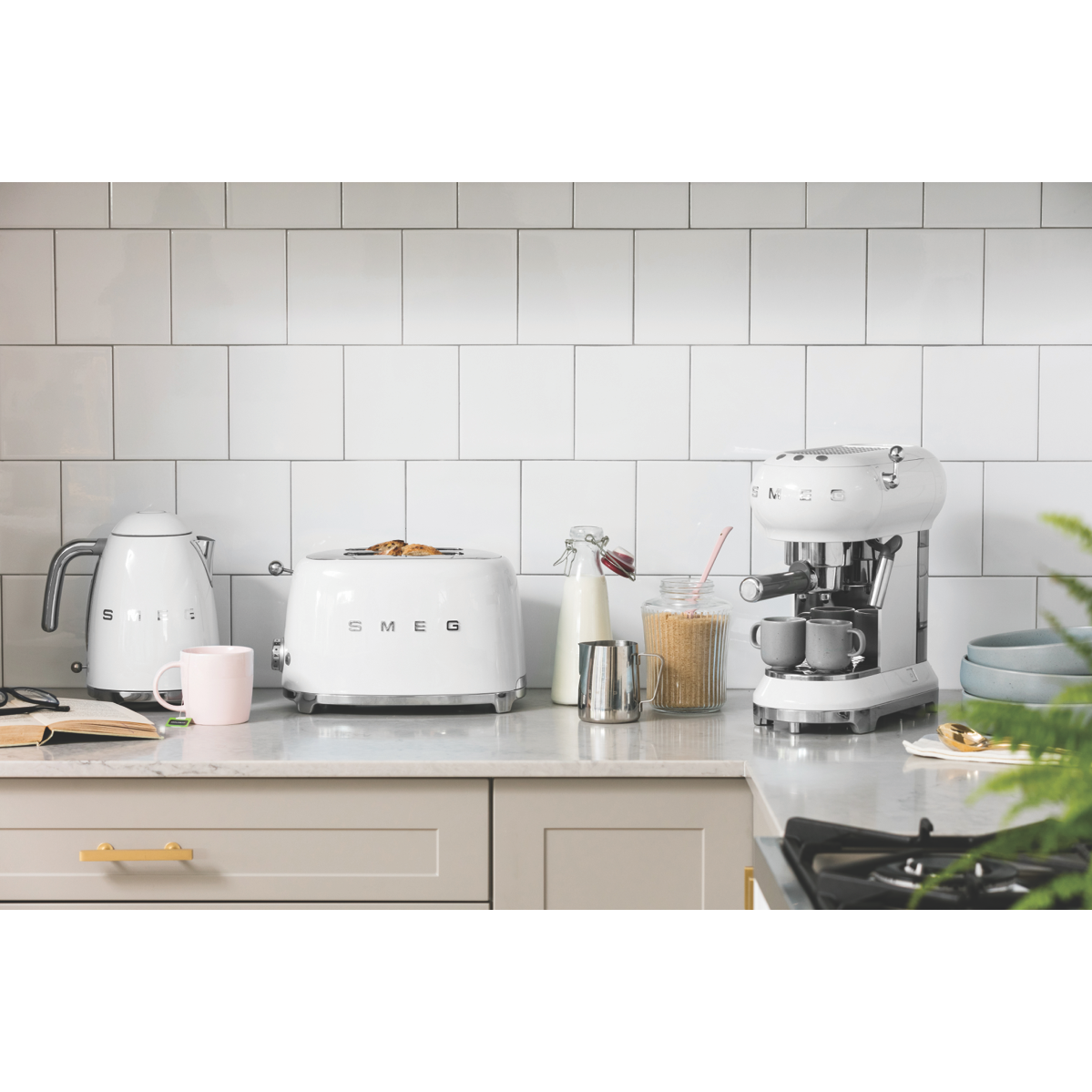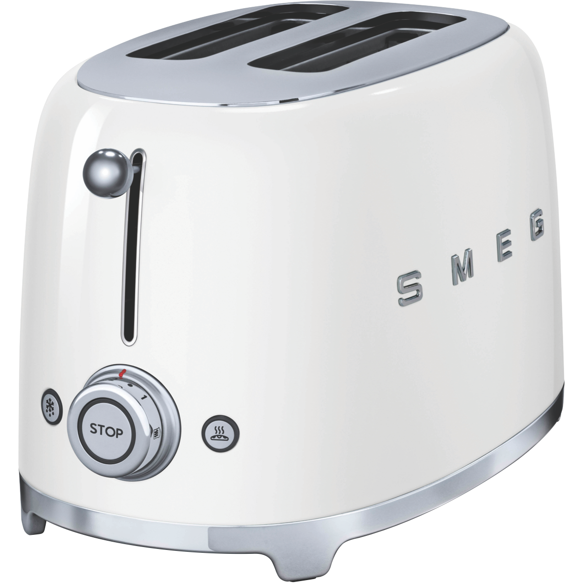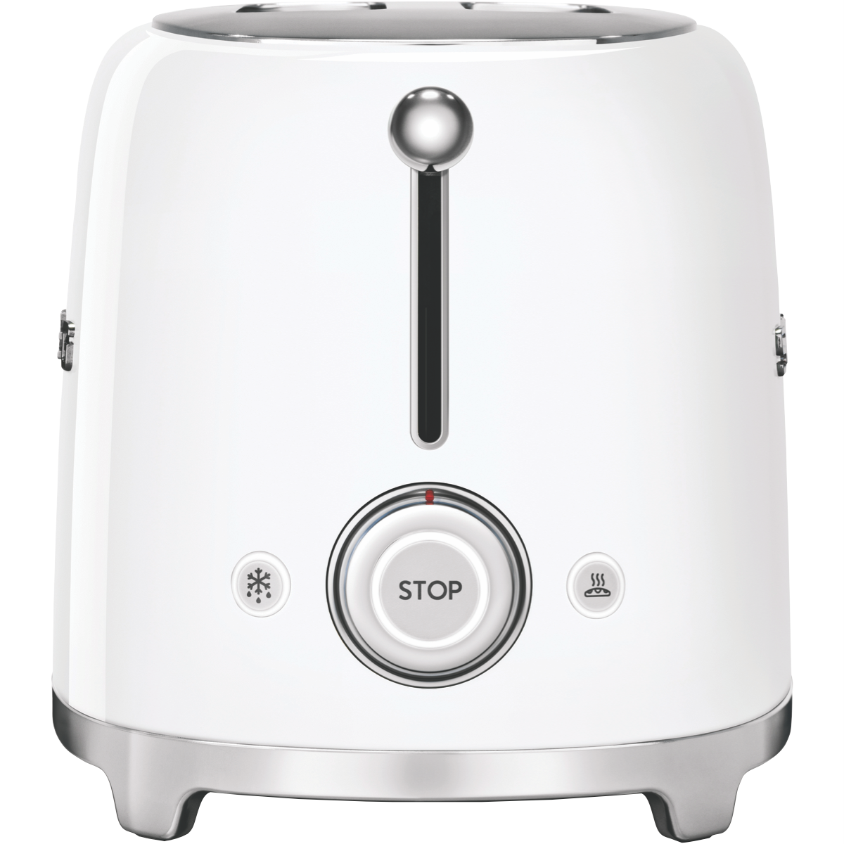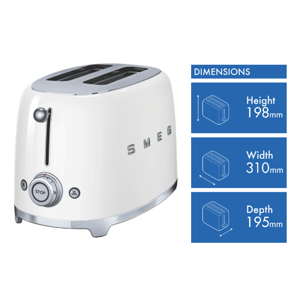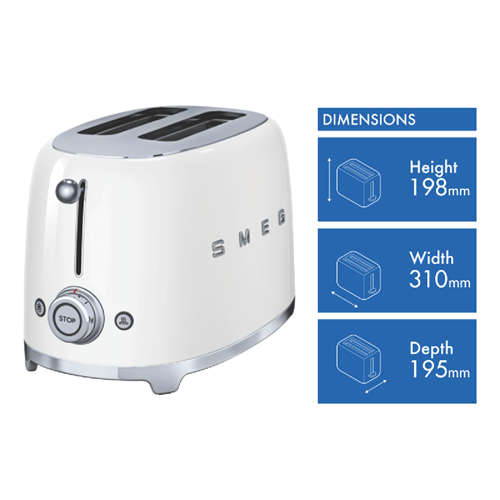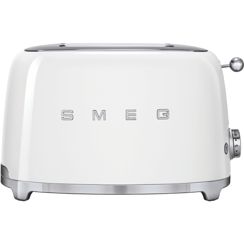 Capture the retro aesthetic in your kitchen with this timeless Smeg 50's Retro Style 2 Slice Toaster TSF01WHAU in white. Featuring the iconic Smeg 1950s silhouette with enamelled-coated stainless steel body and retro logo the award-winning Smeg toaster has six variable toasting levels and three pre-set programs - Defrost Reheat and Bagel - for ideal toasting each time. It features self-centring racks for even browning as well as a removable stainless steel crumb tray for easy cleaning. Get toast browned your way with the browning level adjustment function. It has anti-slip feet and built-in cord storage. Complete with an LED-backlit stylish control knob and stainless steel lever this Smeg retro toaster is the perfect companion to the Smeg 50's Retro Style Kettle for classic statement pieces you'd happily want to be seen.