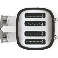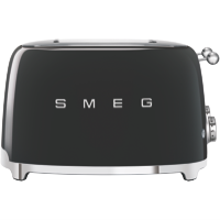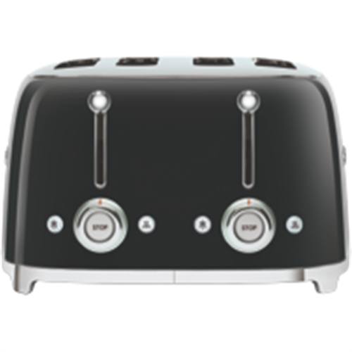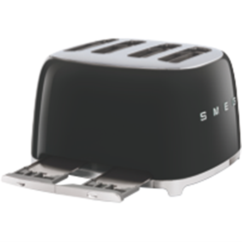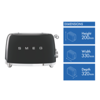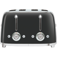 You can toast up to four slices of bread - even artisan style ones - thanks to the four extra-wide slots of this black Smeg 50's Retro Style 4 Slot Toaster TSF03BLAU. Featuring the iconic Smeg 1950s silhouette with enamelled-coated stainless steel body retro logo and chrome detailing this beautiful Smeg toaster features six variable toasting levels and three pre-set programs - Defrost Reheat and Bagel - for ideal toasting each time. It features self-centring racks for even browning as well as a removable stainless steel crumb tray for easy cleaning. Get toast browned your way with the browning level adjustment function at the two separate control knobs to control two toasting slots at a time. It has anti-slip feet and built-in cord storage. Complete with stylish LED-backlit controls and buttons and stainless steel levers this Smeg 4 slot toaster is the perfect companion to the Smeg 50's Retro Style Kettle for classic statement pieces you'd happily want to be seen.
