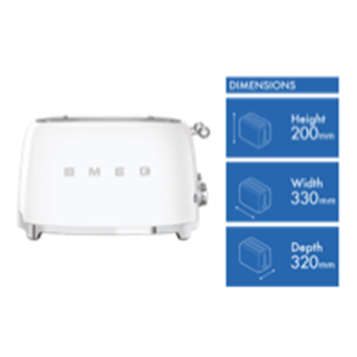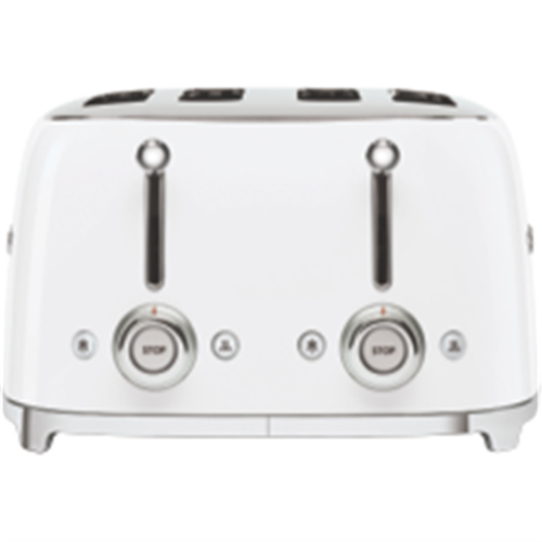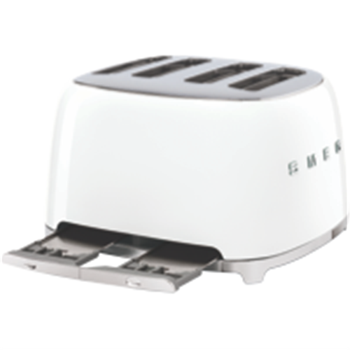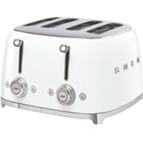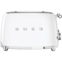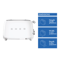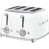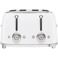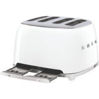 You can toast up to four slices of bread - even artisan style ones - thanks to the four extra-wide slots of this cream coloured Smeg 50's Retro Style 4 Slot Toaster TSF03WHAU. Featuring the iconic Smeg 1950s silhouette with enamelled-coated stainless steel body retro logo and chrome detailing this beautiful Smeg toaster has six variable toasting levels and three pre-set programs - Defrost Reheat and Bagel - for ideal toasting each time. It features self-centring racks for even browning as well as a removable stainless steel crumb tray for easy cleaning. Get toast browned your way with the browning level adjustment function at the two separate control knobs to control two toasting slots at a time. It has anti-slip feet and built-in cord storage. Complete with stylish LED-backlit controls and buttons and stainless steel levers this Smeg 4 slot toaster is the perfect companion to the Smeg 50's Retro Style Kettle for classic statement pieces you'd happily want to be seen.