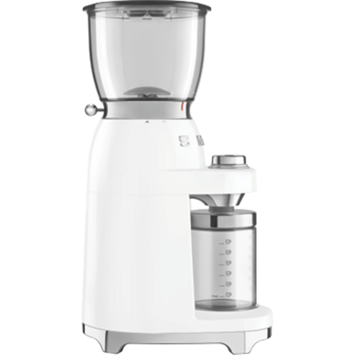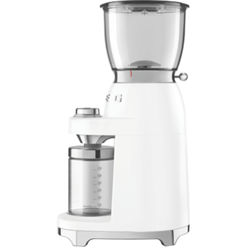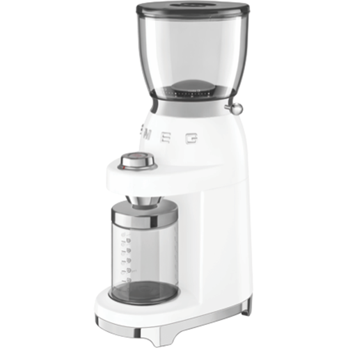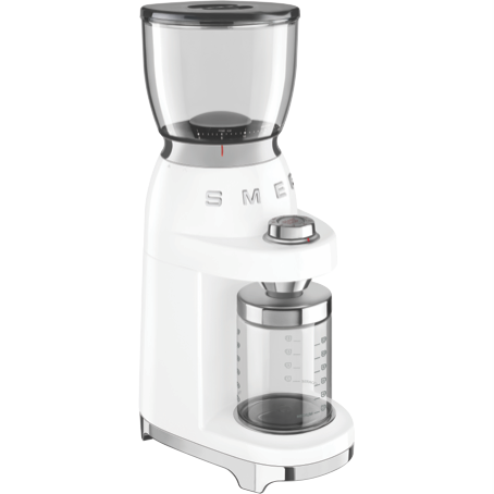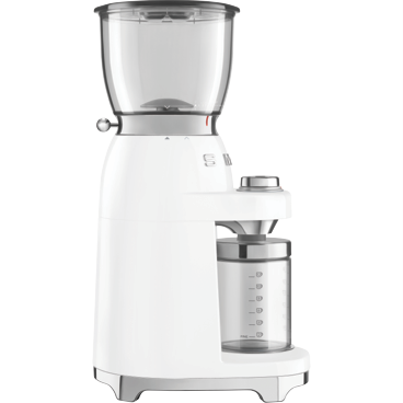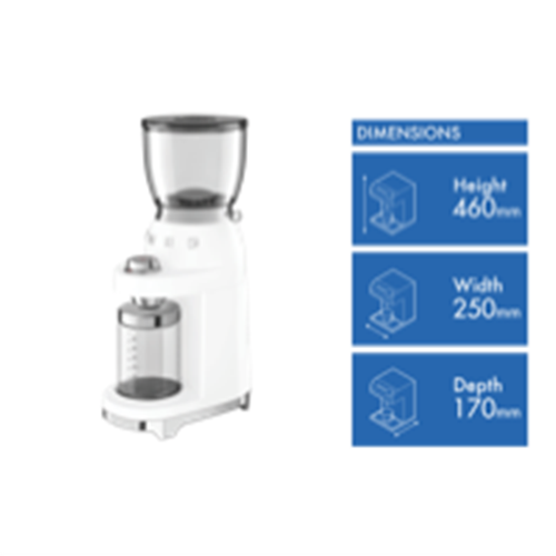 An ideal accompaniment to your Smeg coffee machine the white Smeg 50's Retro Style Coffee Grinder CGF01WHAU helps you perfect the ideal grind for coffee your way. A generous 350-gram capacity allows for ample storage of the freshest coffee beans while the conical burr grinder transfers less heat to the beans preserving the flavour for a more delicious brew. Select from 30 grinding levels to achieve fine medium or course ground coffee for an authentic cafe style experience - from a coarse grind for cold brewing through to a fine grind for the perfect espresso. It has two espresso functions six American coffee and French press functions and a manual function. Its anti-slip base provides greater stability throughout the grinding process. Your guests will arrive to the fragrant aroma of freshly ground coffee thanks to this Smeg coffee grinder.