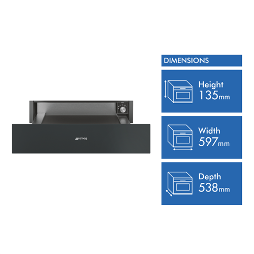Bring elegant modern style to your kitchen with the Smeg 60cm Classic Warming Drawer. With its sleek matt black finish and stainless steel handle this drawer blends beautifully into any décor. The spacious 21 litre capacity accommodates plates bowls and more while the six preset functions - including defrost proofing and dish warming - ensure your dishes are ready whenever you are. The generous 597mm width provides ample space for large platters and casserole dishes. Installation by a licensed electrician allows for a safe seamless addition to your cooking space. With a two year manufacturer's warranty you can trust the quality and reliability of this warming drawer. Its 135mm height and 538mm depth fit perfectly into your existing cabinetry. Make meal prep easy and add sophisticated style with the Smeg Classic Warming Drawer. The manufacturer's part number for this product is CPRA315MB. Enhance your cooking experience today.