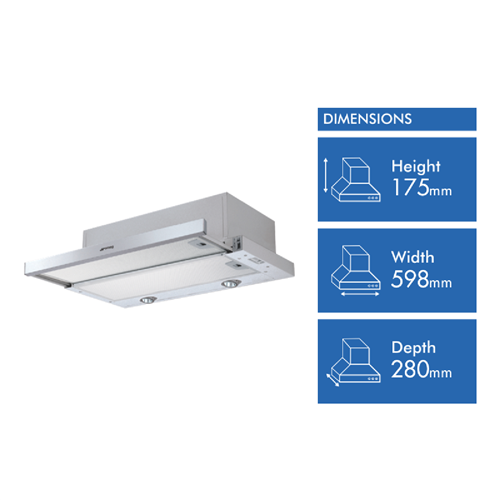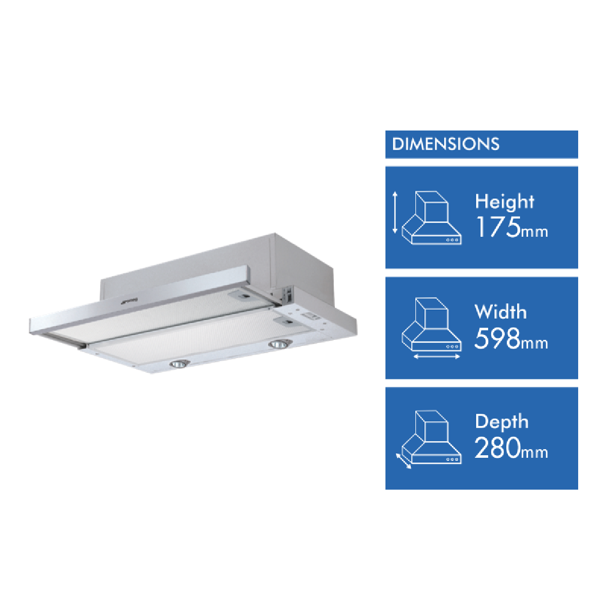 Bring sleek style and superb extraction to your kitchen with the Smeg 60cm Stainless Steel Slideout Rangehood. This stylish rangehood features a smooth stainless steel finish that will complement any modern decor. With a powerful 140W motor and impressive 440m3/hr extraction capacity this rangehood quickly eliminates cooking odors grease and smoke. The slide-out design provides convenient access for cleaning while the dishwasher safe aluminum filters are easy to maintain. With three fan speeds to choose from you can adjust the airflow to suit your cooking. LED lights illuminate the cooktop for safer cooking and easier cleaning. At 175mm high and 598mm wide this rangehood is sized to fit above most 60cm cooktops or ranges. With a low noise rating range of 54-67 decibels you can cook in peace.Backed by a 2 year manufacturer's warranty for peace of mind the Smeg 60cm Slideout Rangehood combines stylish looks with strong extraction power. Bring home efficient quiet performance with this modern kitchen rangehood. The manufacturer's part number for this product is STH600X1.