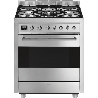 Bring home the ultimate cooking experience with the Smeg 70cm Dual Fuel Upright Cooker. This stainless steel freestanding oven adds a touch of retro style to your kitchen while providing exceptional functionality. With a spacious 79 litre capacity you can cook for the whole family. The gas cooktop features 5 burners to accommodate multiple pots and pans simultaneously. The fully programmable display and 8 oven functions including fan forced bakers function and convection baking provide exceptional versatility. Cook everything from perfectly crisp pizzas to moist cakes with ease. The triple glazed oven door keeps the heat inside for energy efficient cooking. With flame failure protection on each burner and a 2 year manufacturer's warranty you can trust this cooker to deliver performance and safety. This dual fuel upright cooker will be the stylish multifunctional centerpiece of your kitchen. Bring home delicious dinners and memorable moments with family and friends. The manufacturer's part number for this product is CS7GMXA. Consider the Smeg 70cm Dual Fuel Upright Cooker for your home.