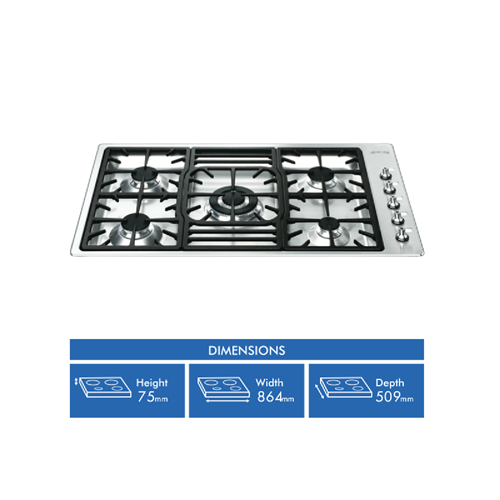 Step up your cooking game with the powerful yet stylish Smeg 90cm 5 Burner Gas Cooktop. This stainless steel beauty will be the centerpiece of your kitchen with its sleek aesthetic and ultra-efficient burners. Cook like a pro with the triple ring ultra-rapid burner that delivers an intense 18500 BTU heat output for searing stir frying and boiling. Three semi-rapid burners give you precise control with up to 9500 BTU while the handy auxiliary burner is perfect for simmering sauces or keeping food warm. The durable cast iron trivets protect your cooktop and support all your pots and pans. With automatic ignition and flame failure safety device this Smeg cooktop combines performance with peace of mind. Whip up restaurant-quality meals at home with 5 ultra-responsive gas burners sleek stainless steel finish and powerful output up to 18500 BTU. This 90cm wide cooktop will be the high-performance heart of your kitchen. Visualize sizzling steaks boiling pasta and simmering sauces with this versatile and safe 5 burner gas cooktop from Smeg. The manufacturer's part number for this product is PGA95-4.