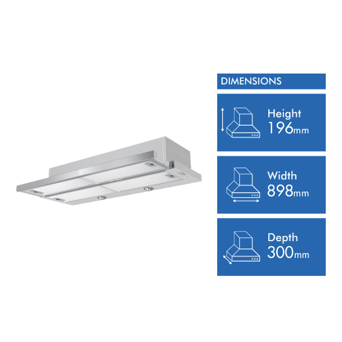 Elevate your kitchen with the Smeg 90cm stainless steel slideout rangehood featuring a powerful 140W motor and 3 fan speeds to efficiently extract airborne grease and odours. With a maximum extraction capacity of 440m3/hr and low noise rating of 54-67 decibels this ducted/recirculated model maintains a quiet operation while cleaning the air. The sleek stainless steel finish and LED lights create an elegant modern look while the push button controls and dishwasher safe aluminium filters make cleaning hassle-free. Designed for simple installation this rangehood combines high performance with sophisticated style. With a 2 year manufacturer's warranty this 90cm wide rangehood provides an efficient user-friendly solution for today's busy cooks. The manufacturer's part number for this product is STH900X1. Seize control of your kitchen's air quality with the Smeg Slideout Rangehood today.