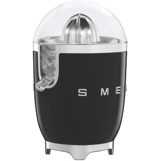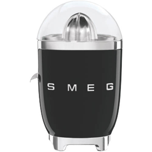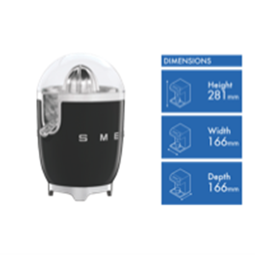 Bring retro style and modern juicing technology to your kitchen with the sleek Smeg 50's Style Citrus Juicer in classic black. This chic juicer makes short work of citrus fruits like lemons limes and oranges thanks to its 70-watt motor and premium juicing components. The die cast aluminum and plastic construction provides durability while the auto on/off function adds convenience. Juice drips into a chrome-accented bowl set atop a secure base with anti-slip feet. A lid and built-in cord storage promote a tidy countertop. With a 166mm width 281mm height and 166mm depth this 2.56kg juicer takes up minimal space. Smeg backs it with a 2-year warranty. The manufacturer's part number for this product is CJF01BLAU. Bring fresh delicious citrus juice into your home with the Smeg 50's Style Juicer.
