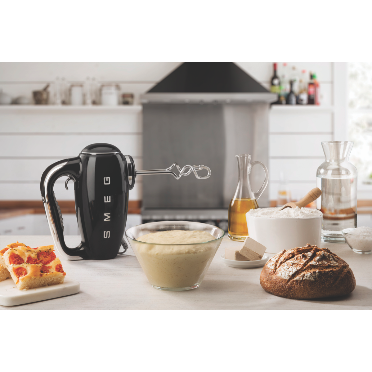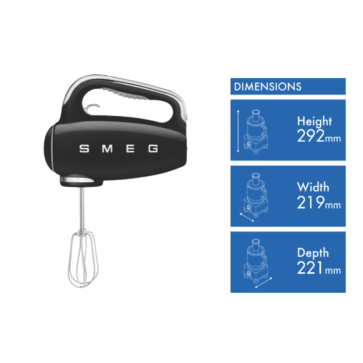 Take your kitchen creations to the next level with the Smeg Digital Hand Mixer in sleek black. With 9 speed levels plus turbo function this retro-style hand mixer makes quick work of mixing whipping and kneading. The powerful 250W motor and chrome beaters effortlessly handle thick batter and heavy doughs. An ergonomic handle provides a comfortable non-slip grip so you can mix with ease. With a 2 year manufacturer's warranty for peace of mind this hand mixer will be your go-to for baking desserts smoothies and more. Conveniently compact the Smeg Hand Mixer stores neatly in any kitchen drawer. Unleash your inner chef and achieve perfect results every time. The manufacturer's part number for this product is HMF01BLAU. Check out this versatile hand mixer today.