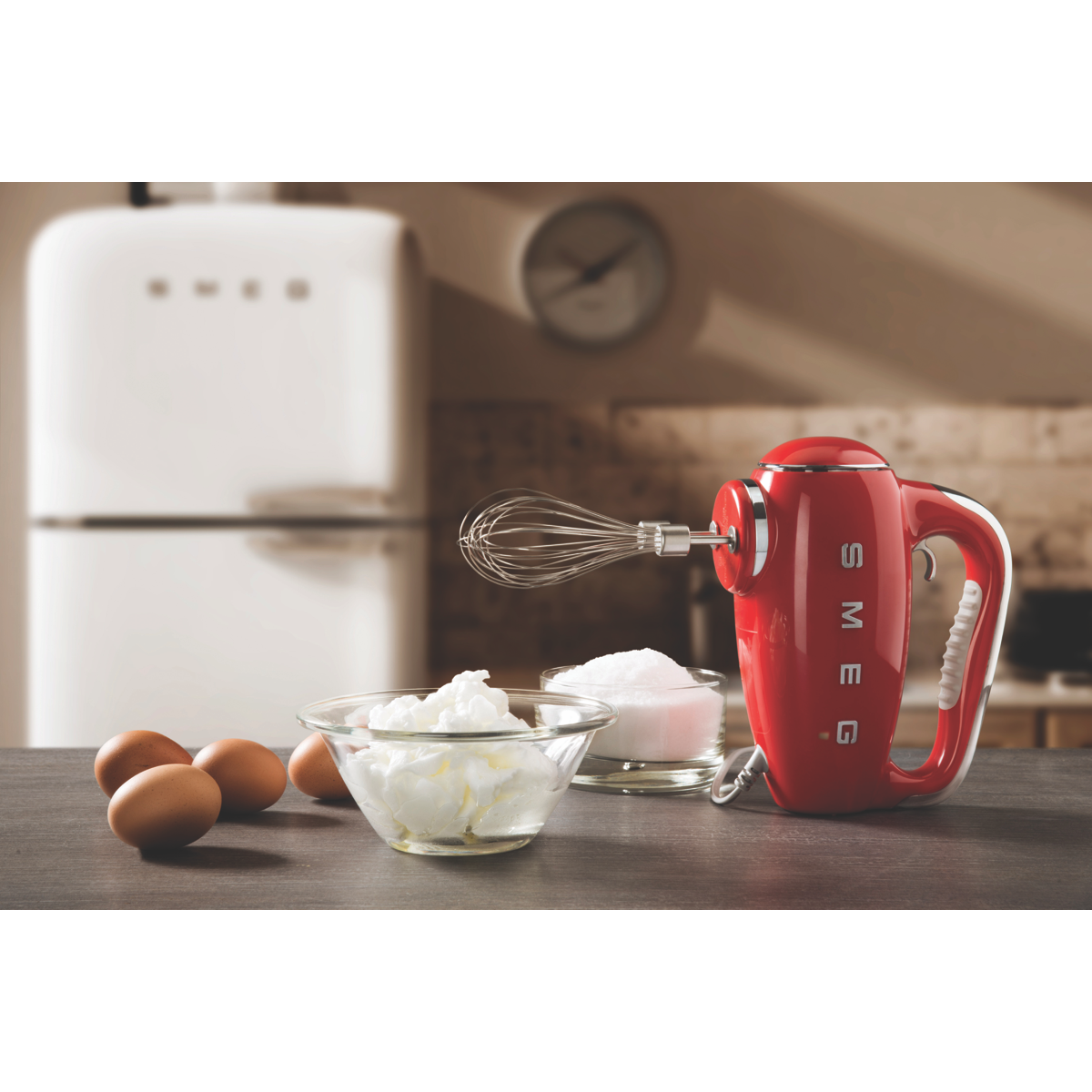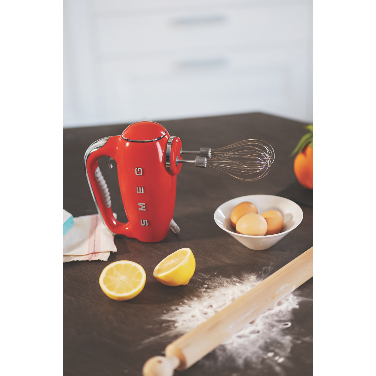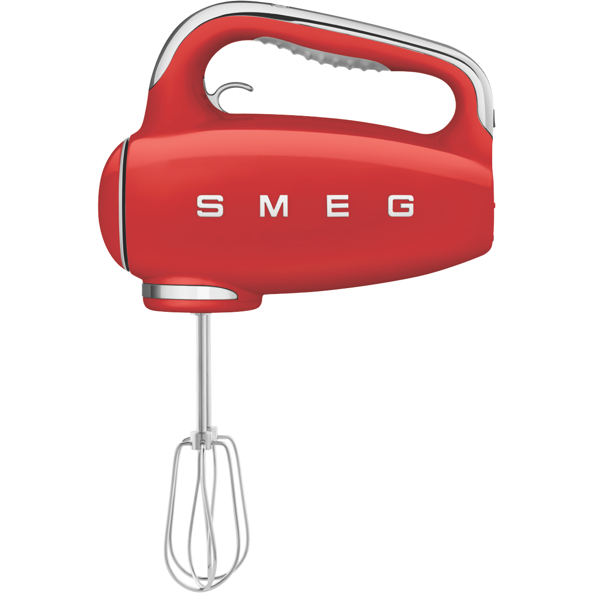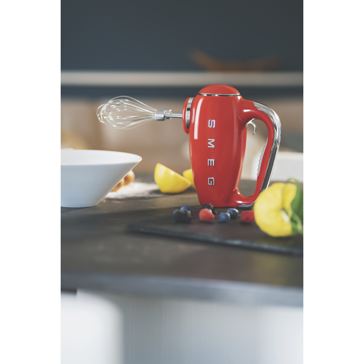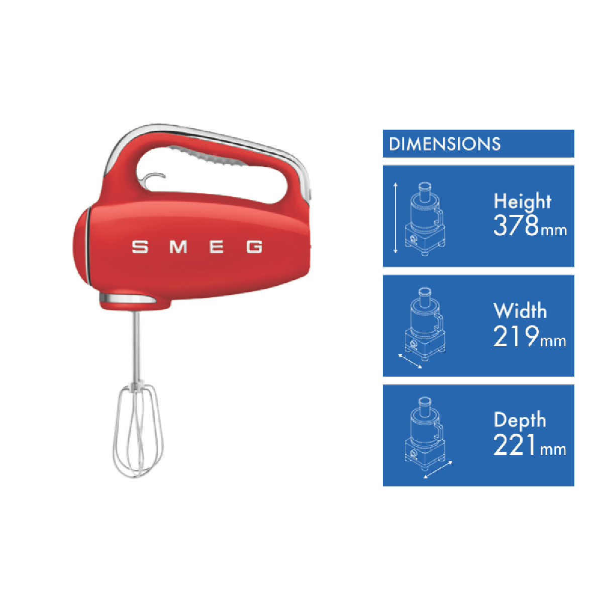 Step into the kitchen with retro style and modern convenience with the Smeg 50's Style Digital Hand Mixer in vibrant red. This powerful hand mixer features 9 speed levels plus a turbo function to whip blend and knead ingredients with ease. With an optimized shape and soft grip handle you'll stay in control as you mix while the non-slip feet keep the mixer steady. The two wire whisks two optimus whisks and two dough hooks tackle any recipe. And when you're done pack it all away in the included Smeg personalized fabric case. Bring passion and precision to the kitchen with this versatile hand mixer. Backed by a 2 year manufacturer's warranty the Smeg Digital Hand Mixer delivers retro charm and reliable performance. The manufacturer's part number for this product is HMF01RDAU. Make your kitchen creations a pleasure with this quality hand mixer from Smeg.