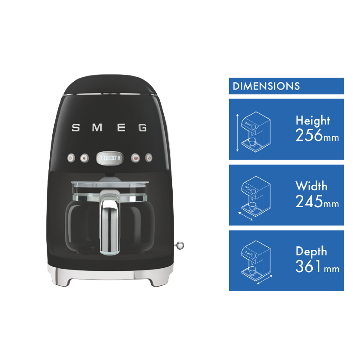 A must-have for coffee lovers the sleek Smeg Drip Coffee Machine brings retro charm to your kitchen counter in a compact design. With a generous 10 cup capacity and 1.25 litre carafe this coffee maker simplifies your morning routine. Programmable auto start lets you wake up to freshly brewed coffee. Maintaining the optimal temperature the keep warm function ensures your coffee is piping hot for second cups. The LED display with integrated clock allows easy programming while the water level indicator takes the guesswork out of refilling. With a nonslip base and one year manufacturer's warranty this coffee machine makes an elegant addition to any home. Towards the end the manufacturer part number DCF02BLAU and warranty information is provided. This stylish coffee maker is sure to be your new morning ritual.