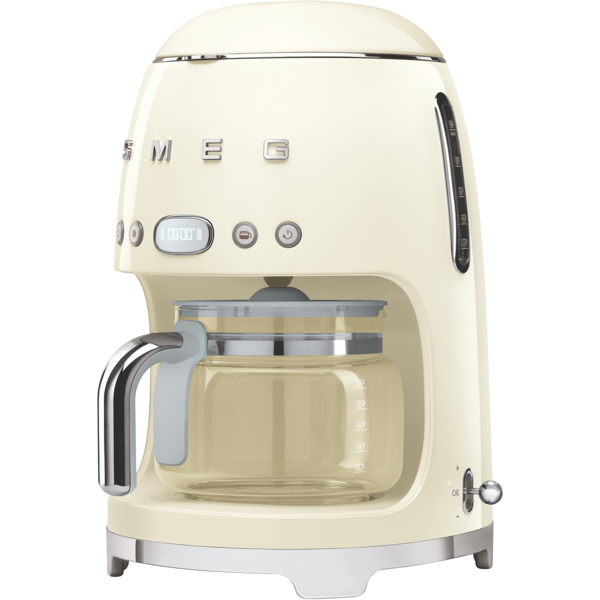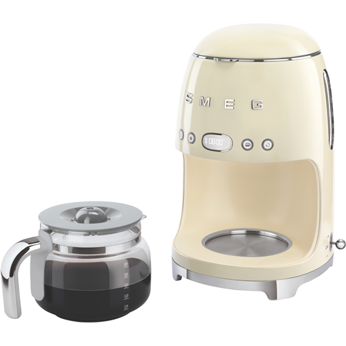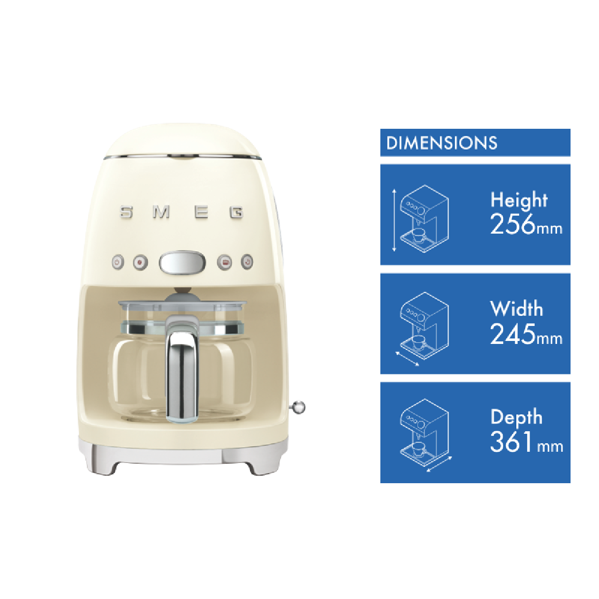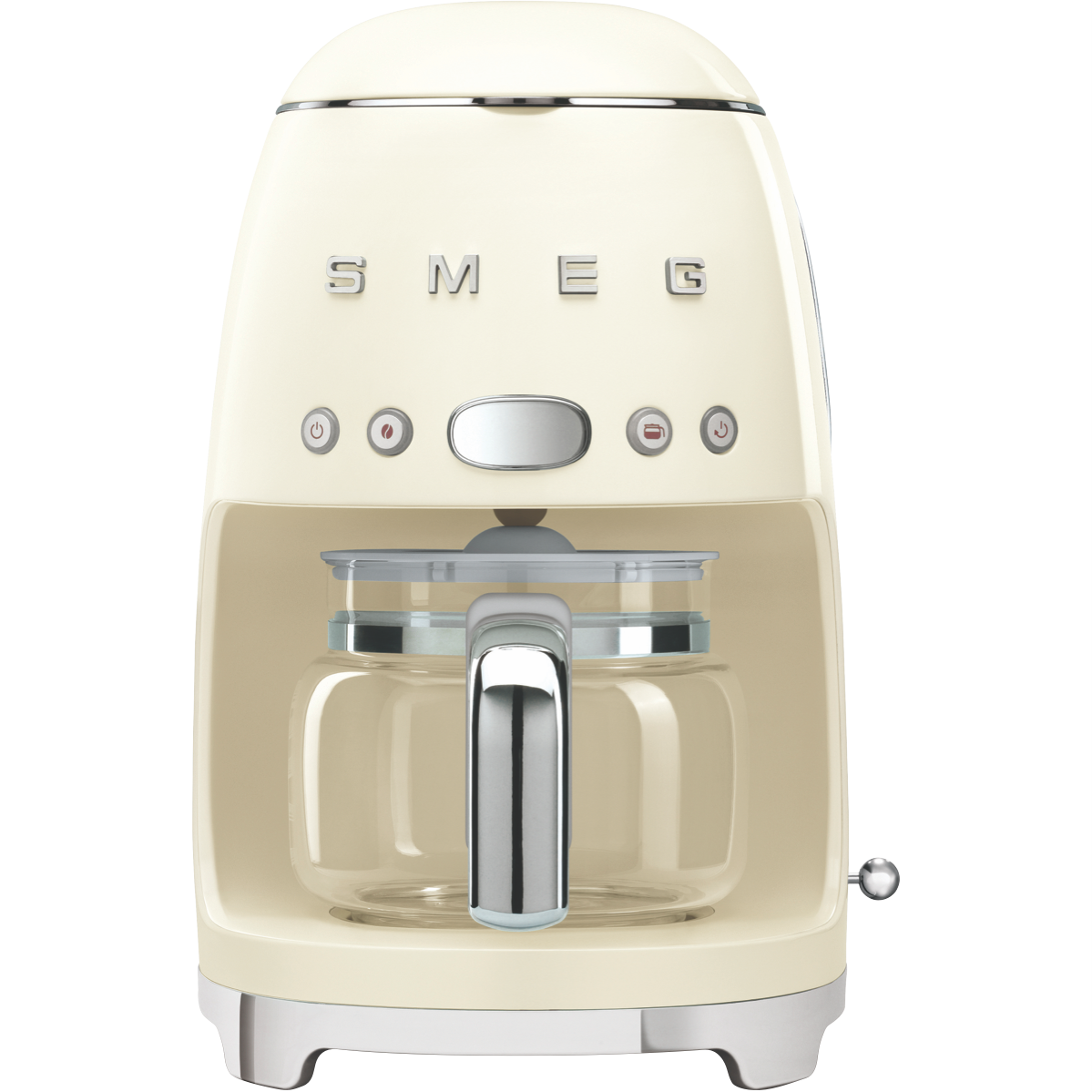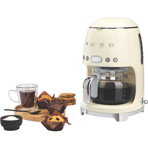 Start your mornings off right with a deliciously brewed cup of coffee courtesy of the retro styled Smeg Drip Coffee Machine in Panna. This 10 cup capacity drip coffee machine can brew up to 1.25 litres of coffee at a time perfect for entertaining or getting the family fueled for the day ahead. The Panna colored machine will add a touch of classic style to your kitchen with its vintage 50's inspired design. With its easy to use control panel and LED display with integrated clock brewing coffee is a breeze. Features like the water level indicator anti slip base and keep warm function ensure optimal functionality. The included glass carafe allows you to monitor your coffee supply. Automated and programmable features like the auto start mode and auto shut off provide convenience and safety. This Smeg coffee machine delivers simple yet customizable brewing for coffee lovers. The manufacturer's part number for this product is DCF02CRAU. Give your mornings a stylish yet functional lift with the Smeg Drip Coffee Machine.
