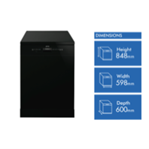 Step into a world of modern convenience with the Smeg Black Freestanding Dishwasher. This sleek black appliance makes easy work of post-dinner cleanup with its ample 14 place settings capacity and 10 diverse wash programs to tackle every kind of mess. The Rapid 27 Min program powers through a full load in just 27 minutes while the Eco cycle minimizes water and energy use for an eco-friendly wash. Dual spray arms distribute water evenly across dishes for a comprehensive clean and adjustable upper and middle racks accommodate all your cookware with ease. Operating at a quiet 47 decibels this dishwasher runs silently so you can run it any time. With handy delay start child lock and flood protection this Smeg dishwasher takes the stress out of doing dishes. Discover efficiency and style with the Smeg Black Freestanding Dishwasher. The manufacturer's part number for this product is DWA6314B2. Learn more about this innovative appliance today.