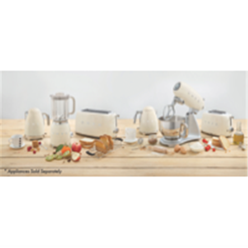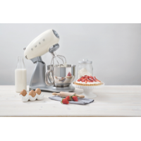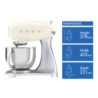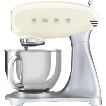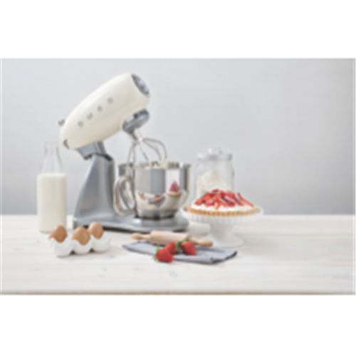 Functionality and impeccable design come together effortlessly with this cream coloured Smeg 50's Retro Style Stand Mixer SMF02CRAU. Housed in the iconic Smeg 1950s retro silhouette with retro logo this vintage-inspired Smeg stand mixer pays homage to a bygone era in true Smeg style backed by plenty of torque for your high-powered mixing needs. Planetary action and 800-watts of power offers optimal mixing for even the heaviest of doughs while this retro stand mixer's 10 settings allow you to achieve precise and thorough mixing for any baking task - from kneading dough mixing cake batter whipping egg whites and more. Its automatic smooth start ensures effective mixing with no splatter of ingredients outside the bowl and it works quietly even at full power. It includes a wire whisk flat beater dough hook 4.8 litre stainless steel bowl with ergonomic handle and a pouring shield. Plus with its front accessory port and the optional accessories sold separately your Smeg stand mixer can roll out sheets of pasta grind meats or slice and grate vegetables to make food preparation a breeze. It has a reliable direct drive motor die-cast aluminium body heavy duty metal construction and anti-slip feet; making it robust stable and durable. Boasting signature Italian design in a gorgeous retro aesthetic you'd be proud to show off your Smeg stand mixer.