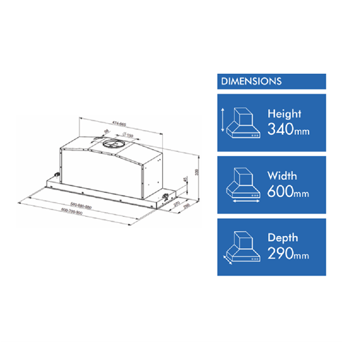This sleek 60cm undermount rangehood brings a touch of style to your kitchen with its brushed stainless steel finish. Featuring three fan speeds plus an intensive mode it tackles cooking odours with impressive 740m /hr extraction capacity. The LED back-lit electronic buttons make operation simple while the two stainless steel anti-grease filters keep maintenance easy. You can install it to duct outside or recirculate air inside with 150mm diameter ducting required. LED lighting illuminates your cooking area clearly and at 46-66 decibels it won't overwhelm conversation. Measuring 600mm wide by 290mm deep and 339mm high this Smeg rangehood (SHU671X) comes with a 2 year manufacturer's warranty.