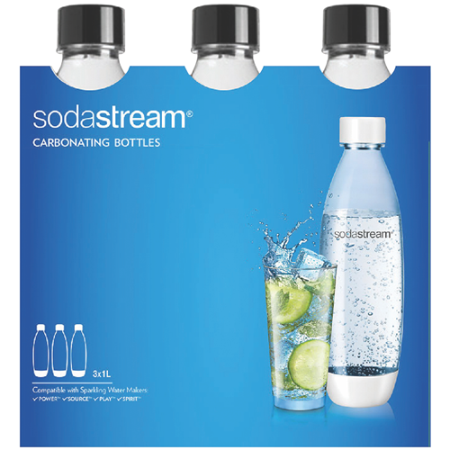 Refresh your drinks and reduce plastic waste with this Sodastream 1 Litre Fuse Triple Pack. These sleek black carbonating bottles let you create sparkling water and soft drinks at home. Each BPA-free bottle features a hermetic sealing lid to keep your bubbly beverages fizzy for longer. With a lifespan of 3 years these durable bottles will make it easy to enjoy fizzy drinks again and again. The 1 litre capacity gives you plenty to share. Make your own sodas flavoured waters and more without the need for heavy bottles and plastic waste. These reusable carbonating bottles are an eco-friendly way to enjoy drinks just the way you like them. With their modern style and convenient size they will look great on your kitchen counter or dining table. Give your drinks a boost of bubbles with the Sodastream 1 Litre Fuse Triple Pack today. The manufacturer's part number for this product is 1741321610. Check them out now to start enjoying fizzy drinks your way.