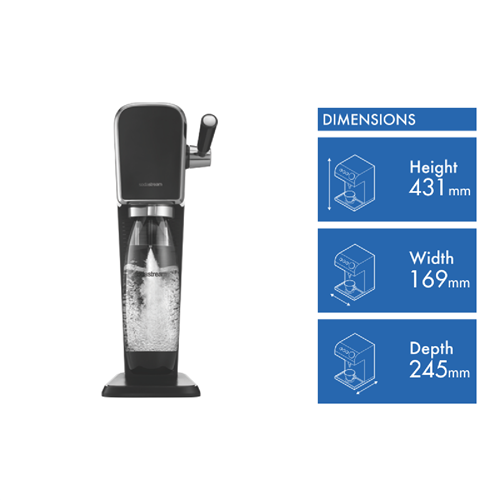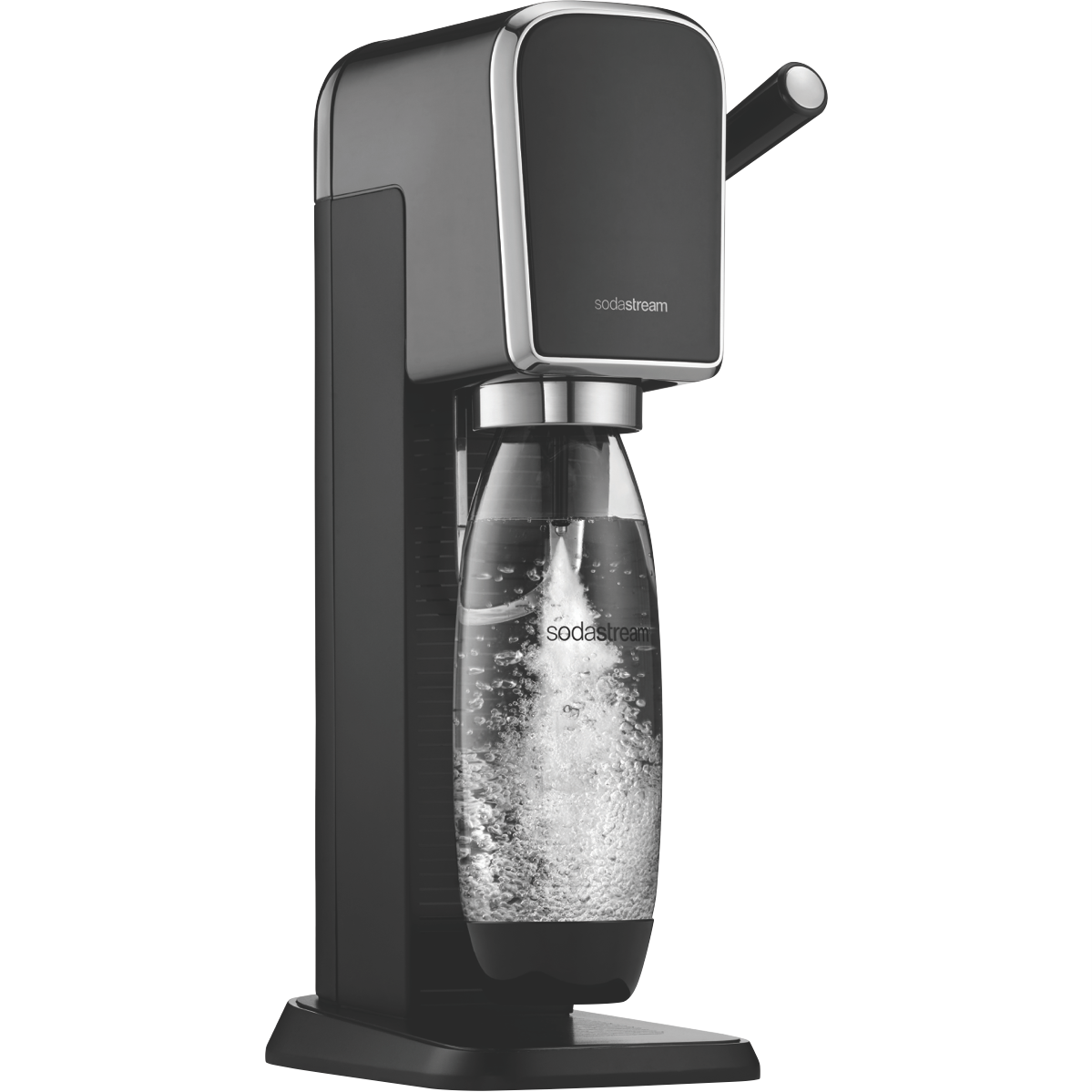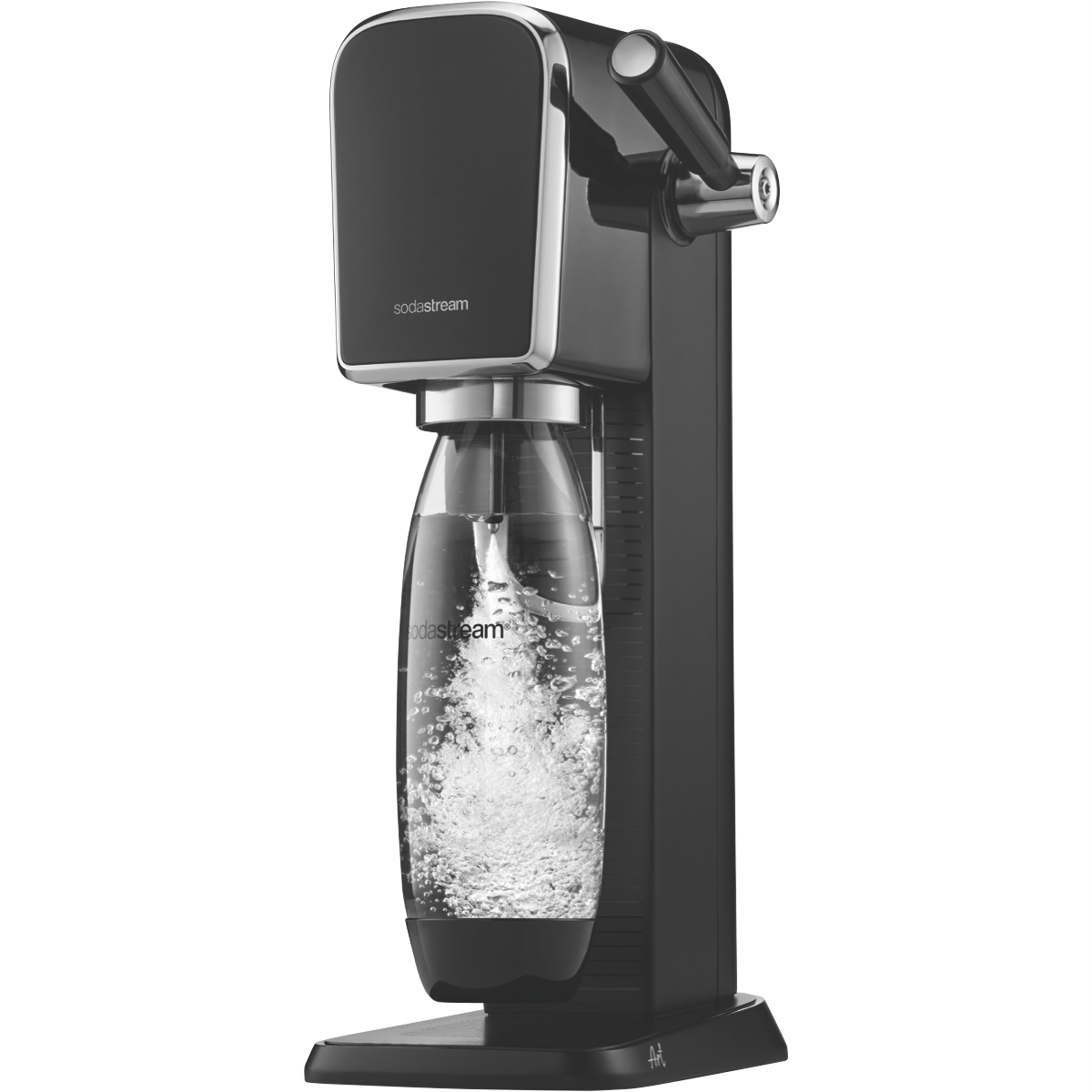 Fizz your water in style with the Sodastream Art Black Sparkling Water Maker 1013511611. The Art comes with Sodastream's amazing Quick Connect gas cylinder installing with just one click from inserting no twisting required. Sink into the Spark Design Awards winning design with stainless steel trimmings and precise control thanks to a retro carbonating lever. Easily fit it anywhere around the house thanks to cordless operation and an included dishwasher safe bottle means clean up is easy. Soda your own cordials iced teas syrups and more(1). Disclaimers: (1) Sodastream makers only support the carbonation of water into soda water with syrups/mixers added afterwards. Do not attempt to carbonise other liquids in Sodastream makers.