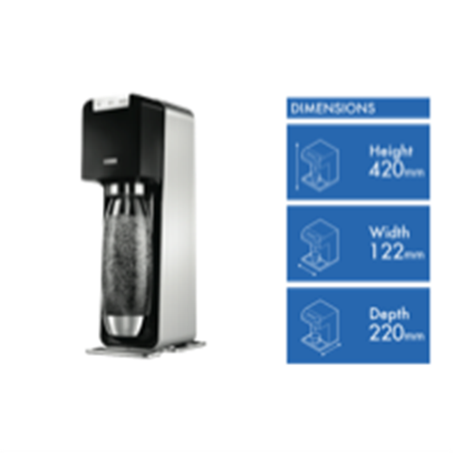 Additional Features Includes a 60 litre SodaStream CO2 Cylinder that makes up to 60 bottles of sparkling water. Three levels of automated carbonation, so you can reach your favourite bubbly taste in seconds. Premium design suitable for every stylish kitchen.