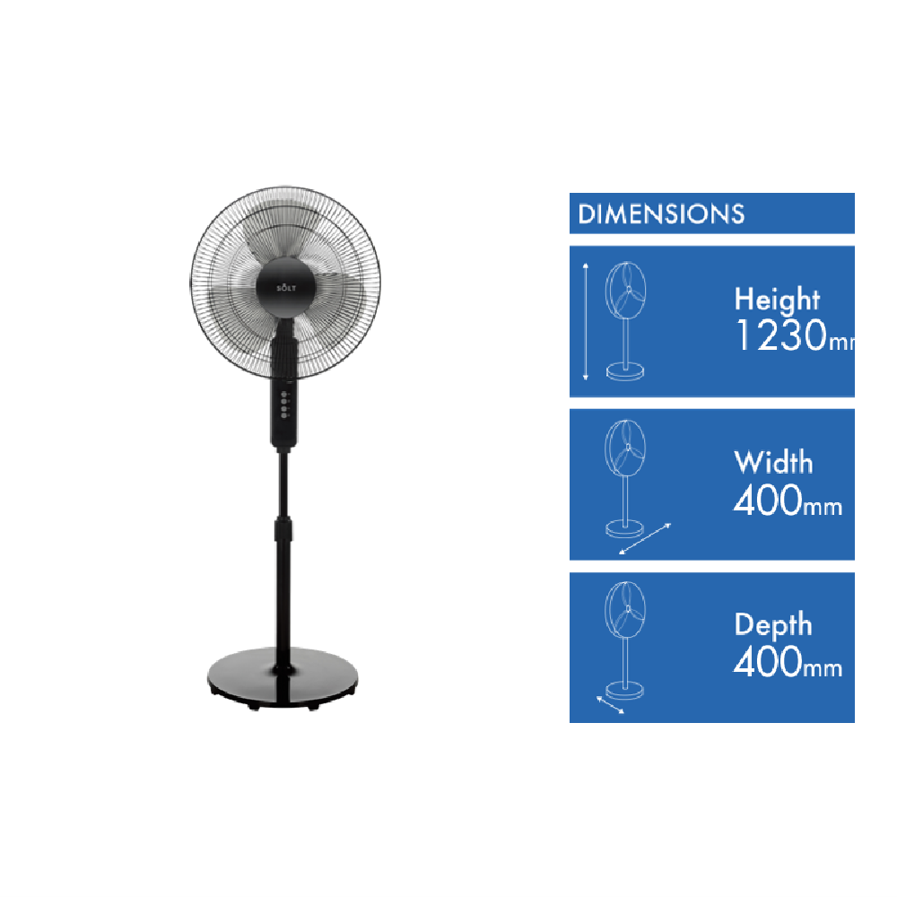 Bring a refreshing breeze into your home with the Solt 1.4m Pedestal Fan. This sleek black pedestal fan features 3 speed settings to provide cooling comfort on demand. With a powerful 400mm blade span and adjustable 1230mm height you can direct the cooling airflow just where you need it. The stable pedestal base keeps the fan steady while the blade oscillates to circulate air throughout the room. Designed for durability this fan is built to provide reliable performance for years to come and is covered by a 2 year manufacturer's warranty. Bring the power of a refreshing breeze into any room with the Solt Pedestal Fan. The manufacturer's part number for this product is GGSPFS14TB. Check it out today and enjoy optimized airflow and cooling comfort.