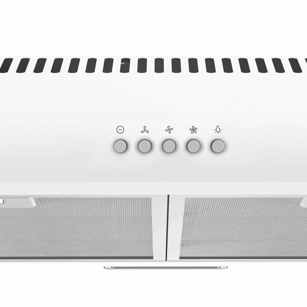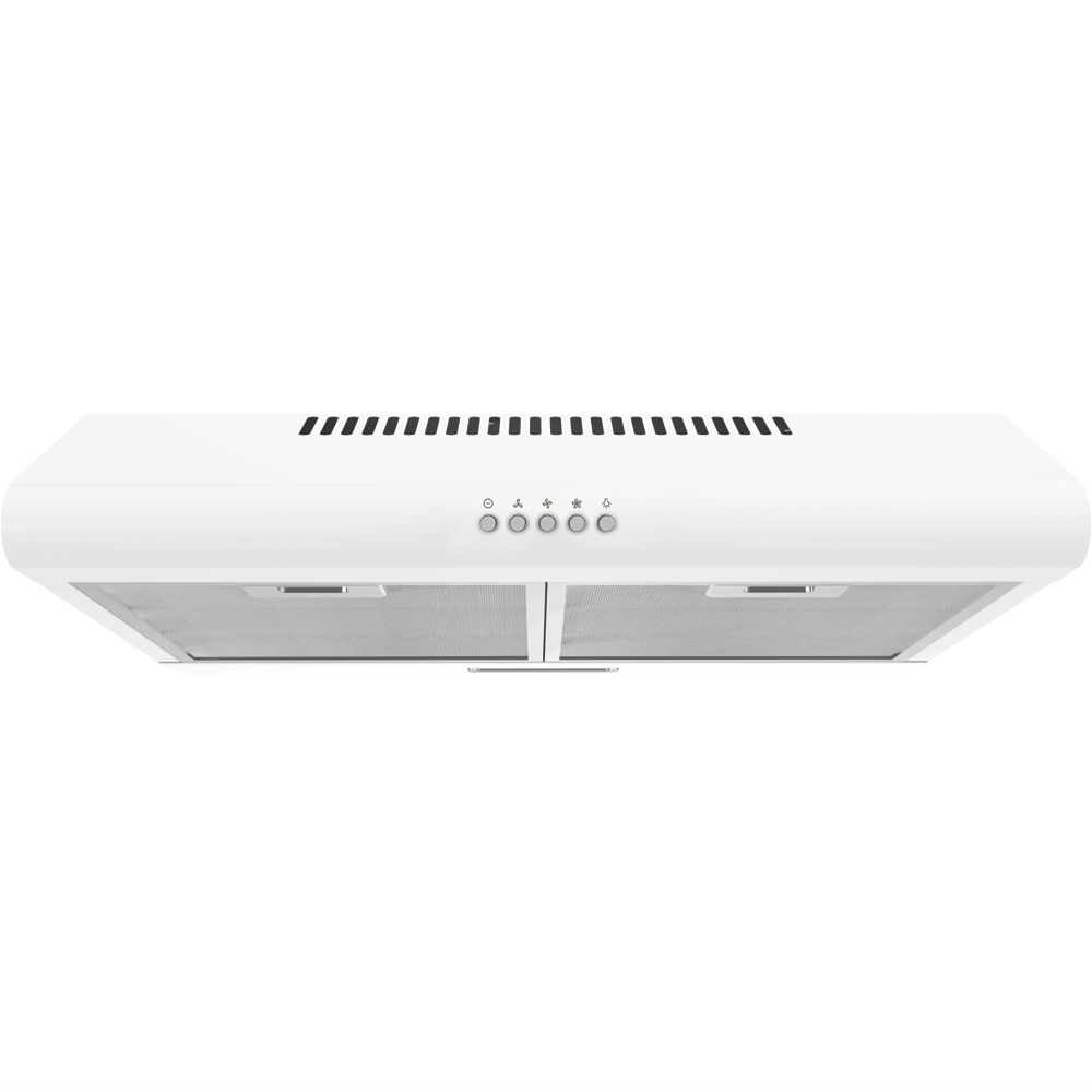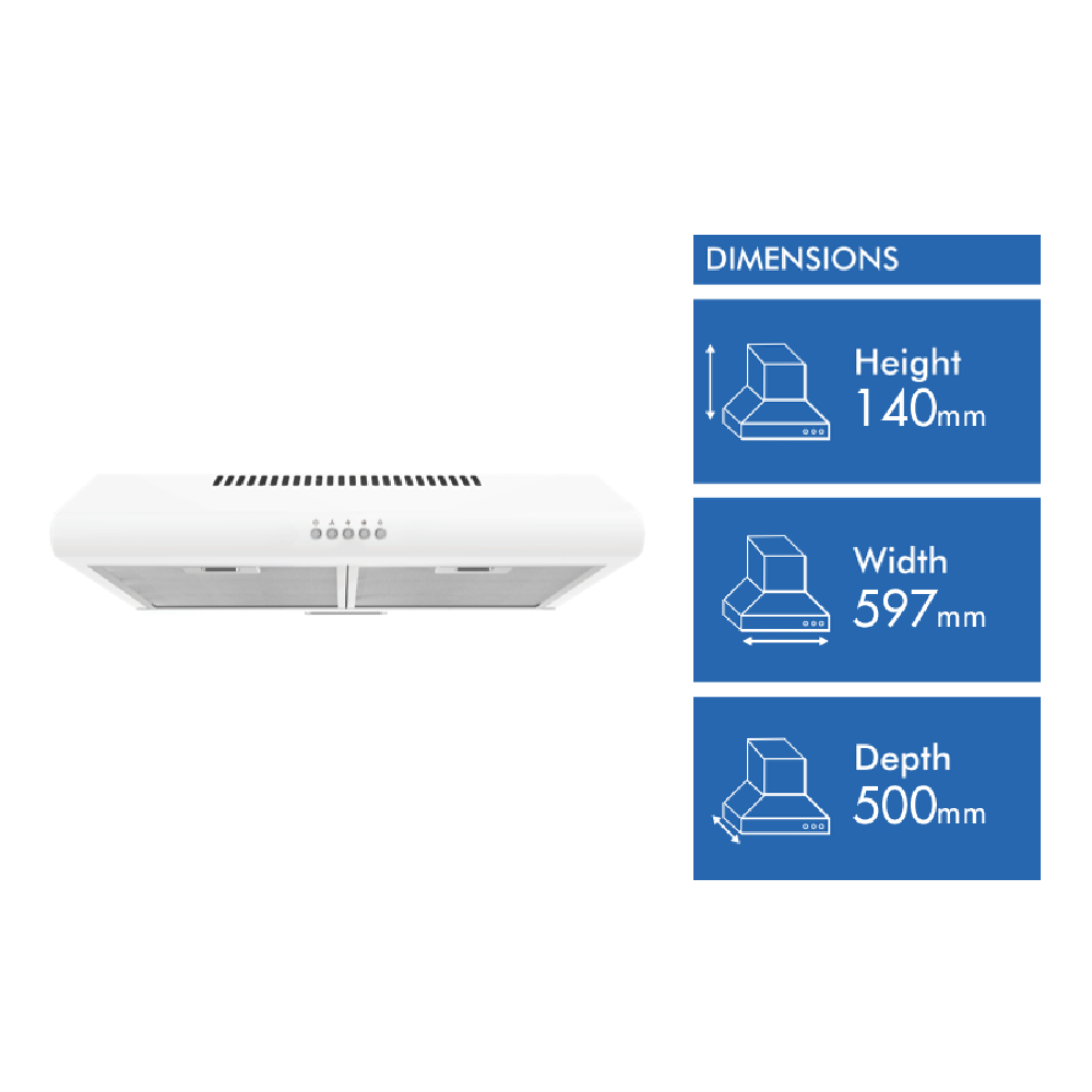 Bring a sleek contemporary style into your kitchen with the Solt 60cm Fixed Rangehood in crisp white. This ducted or recirculating rangehood makes short work of steam grease and cooking odours thanks to its powerful 300 cubic metres per hour extraction capacity and 3 fan speeds. The integrated LED lights illuminate your cooktop brilliantly while the push button controls allow easy operation. The aluminium grease filters are simple to remove and clean. At just 65 decibels this rangehood works quietly to keep your kitchen fresh and clean during meal preparation. With a 597mm width 140mm height and 500mm depth the Solt Rangehood is designed to fit 60cm spaces above your cooktop or stove. It comes with a 3 year warranty plus 2 years with product registration. Manufacturer Part Number GGSRHF600W.