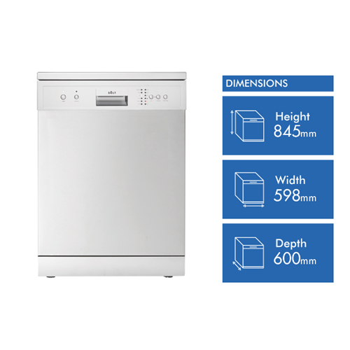 Available exclusively at The Good Guys this Solt 60cm Freestanding Dishwasher GGSDW6012S is finished in silver. The 12-place setting capacity with a height-adjustable upper basket allows you to easily load and wash lots of dishes of various sizes. Minimise your water usage with its 4.5 Star WELS Water Rating WELS License Number D02521 utilising just 10.7 litres per wash when running the 'ECO' program. Select from six wash programs to cover all your cleaning needs: from an 'Intensive' wash for heavily soiled plates to 'Rapid' for a lower temperature wash and reduced cycle time when items are only lightly soiled. Plus the 'Extra Dry' option is available on selected wash cycles such as 'Glass' to get a perfectly dry finish on your glassware. With its freestanding design you can enjoy the flexibility of setting up your dishwasher where you want to thanks to this Solt dishwasher.