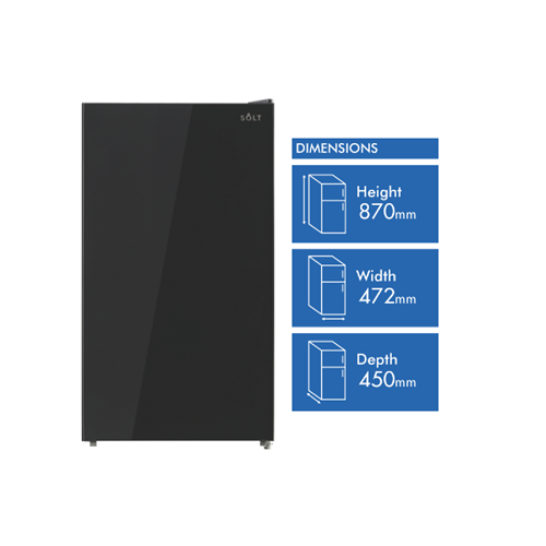 With a sleek black exterior and smoke grey finish the Solt 93L Bar Fridge brings efficient cooling and ample storage to home bars and entertaining spaces. This right hinge fridge offers 93 litres of capacity in a compact 472mm width that slides under counters with ease. The adjustable thermostat and manual defrost functionality allow you to customize cooling and maintain performance. Three glass shelves and three door trays provide versatile storage for drinks fresh foods snacks and more. Specialized features like the chiller compartment and vegetable crisper help keep foods fresh and organized. Reversible door capability and adjustable feet add convenience for any space. Rated 3.5 stars for energy efficiency this fridge helps lower power bills while cooling drinks. Backed by a 2 year manufacturer's warranty the Solt 93L Bar Fridge delivers reliable chilling power. The manufacturer's part number for this product is GGSBF95BG. See how this quality bar fridge can upgrade your home today.