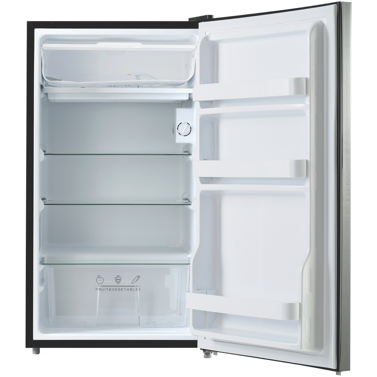 Additional Features Adjustable Thermostat, Reversible Door, Adjustable Feet, Manual Defrost, 3%26#215; Glass Shelves, 3%26#215; Door Storage Trays, Chiller Compartment, Vegetable Crisper,