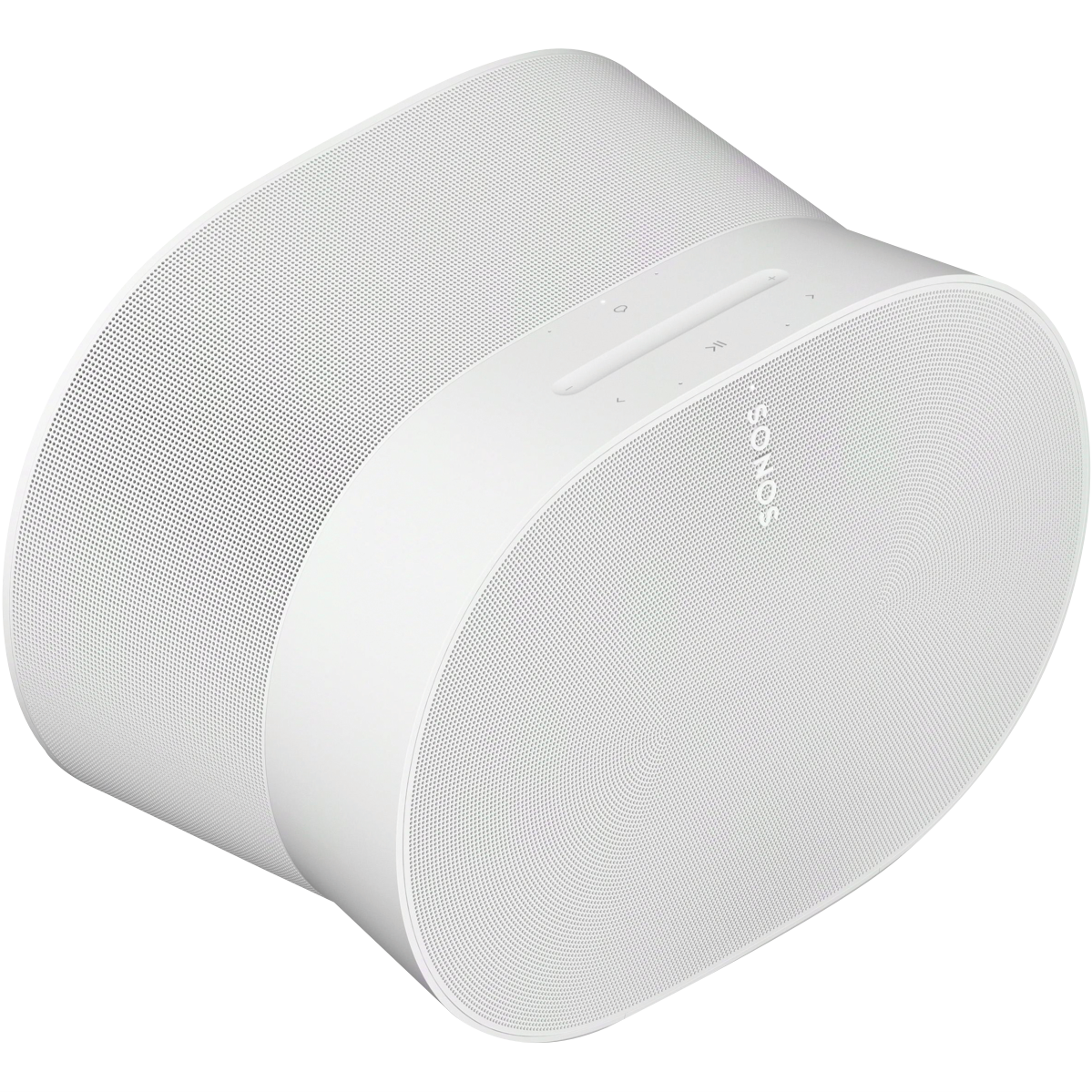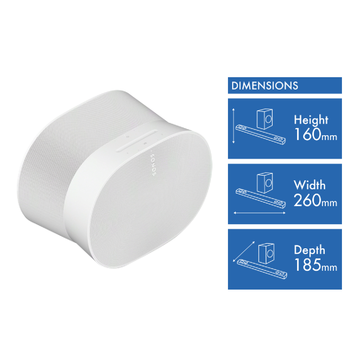 A modern addition to any living space the Sonos Era 300 wireless speaker delivers powerful room-filling sound in a sleek and compact design. With Bluetooth and Wi-Fi connectivity you can stream all your favourite music radio podcasts and more in high-fidelity audio. Control it all easily through the Sonos app or with voice commands using Amazon Alexa. This smart speaker comes in a crisp white colourway and features touch controls making it intuitive to use. It is also humidity resistant so you can enjoy music in the kitchen or bathroom worry-free. Measuring 160mm high 260mm wide and 185mm deep the Sonos Era 300 speaker has a compact footprint that will blend seamlessly into your décor. Additional features like Apple AirPlay 2 compatibility a USB-C port line-in and Ethernet allow for versatile setup options. Bring exceptional sound quality into your home with the Sonos Era 300. Its 1-year warranty provides peace of mind on your purchase. The manufacturer's part number for this product is E30G1AU1. Experience rich room-filling audio by getting the Sonos Era 300 wireless speaker today.