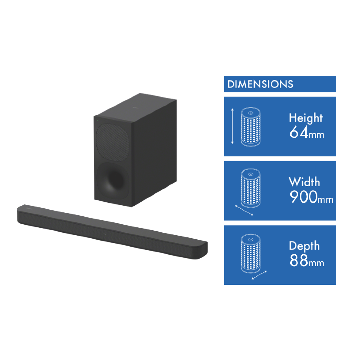 Immerse yourself in powerful 330W sound with the Sony 2.1Ch 330W Soundbar. This sleek black soundbar delivers an audio experience that brings all your entertainment to life. With Bluetooth 5.0 connectivity you can easily stream music from your favourite services for seamless listening. The dedicated subwoofer produces deeper richer bass while the X-Balanced Speaker Units ensure audio comes through clearly and accurately. Whether you're watching the big game or hosting a movie night the multiple sound modes let you customise audio to suit what you're watching. Connect via optical input or HDMI ARC to enhance the sound from your TV. Measuring just 64mm high and 900mm wide this soundbar fits neatly under your TV without cluttering your space. Weighing only 2.4kg it's easy to install almost anywhere. With a 1 year warranty you can enjoy quality audio for years to come. The manufacturer's part number for this product is HTS400. Discover the difference an audio upgrade can make - check out the Sony 2.1Ch 330W Soundbar today.