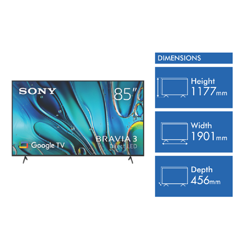 Experience stunning visuals and immersive entertainment with the Sony 85 BRAVIA 3 4K HDR Google TV 24. This expansive 85-inch LED television boasts a vibrant 4K UHD display resolution of 3840 x 2160 pixels delivering breathtaking clarity and detail. The Triluminos Pro colour technology ensures lifelike hues while the 4K HDR Processor X1 optimizes contrast and brightness for captivating HDR content. Enjoy seamless access to popular streaming apps like Netflix Stan Disney+ Amazon Prime Video and more on the intuitive Google TV smart platform. With hands-free and remote control voice assistance from Amazon Alexa and Google Assistant controlling your viewing experience is effortless. Gamers will appreciate the gaming-ready features and smooth 100 Motion Rate for fluid gameplay. Four HDMI inputs and two USB ports provide ample connectivity options. The sleek design with dimensions of 1901mm width 1177mm height and 456mm depth makes this TV a stylish addition to any home entertainment setup. The manufacturer's part number for this product is K85S30. Elevate your viewing experience to new heights with the Sony 85 BRAVIA 3 4K HDR Google TV 24.