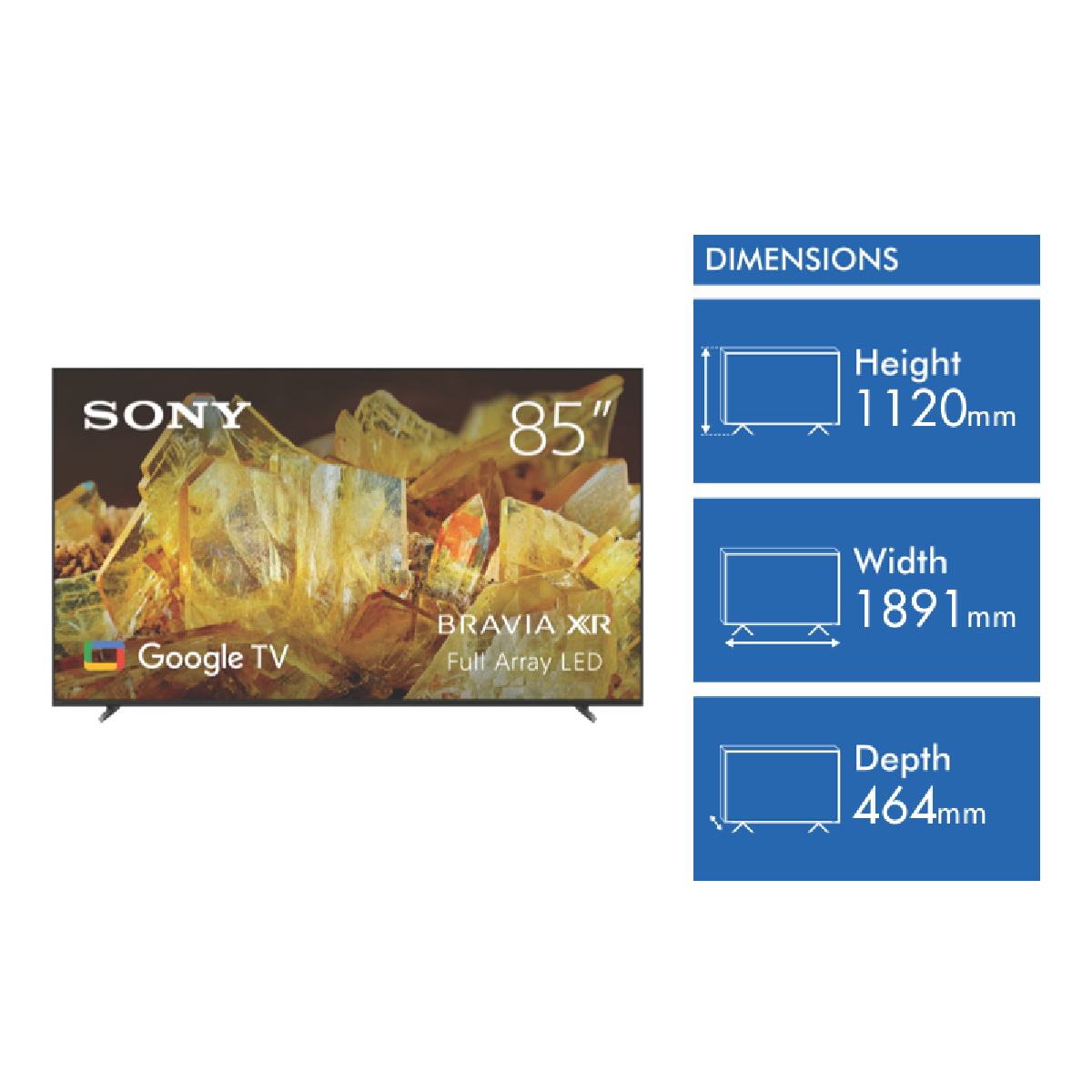 Step into an immersive home entertainment experience with the 2023 Sony 85 X90L 4K BRAVIA XR Full Array LED Google TV. This ultra high definition smart television delivers lifelike 4K clarity and vibrant colors powered by Sony's cognitive processor XR and XR Triluminos Pro technology. With over 8 million self-illuminating LEDs and full array local dimming images come alive with deep blacks and peak brightness. Motion handling is superb with XR Motion Clarity providing smooth blur-free action for sports and movies. Gaming is enhanced by dedicated modes with input lag as low as 8.5ms. As a Google TV voice controls through the included remote make searching for content easy. Built-in Chromecast allows wireless streaming from compatible devices. With Dolby Atmos and DTS Digital Sound audio is as immersive as the picture. Weighing 45.9kg this 85 model features a stylish slim design and can be wall mounted. With an energy rating of 5 stars it meets high efficiency standards. For the ultimate home theatre pair it with Sony's HT-A3000 soundbar. The manufacturer's part number for this product is XR85X90L.