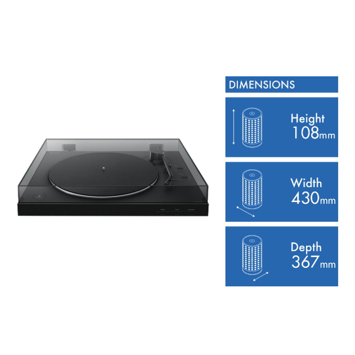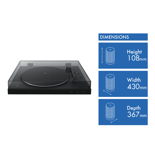 The Sony Turntable with Bluetooth Connectivity PSLX310BT is a fully automatic vinyl record player with Bluetooth 5.0 for easy connections to your true wireless earbuds or headphones. The player features a convenient one step auto playback function switchable gain levels sturdy aluminium tone arm with excellent traceability and diecast aluminium platter. Also included is a felt mat for the platter and a thick removeable dust cover muffling any potential acoustic pressure from a speaker setup for better stability.