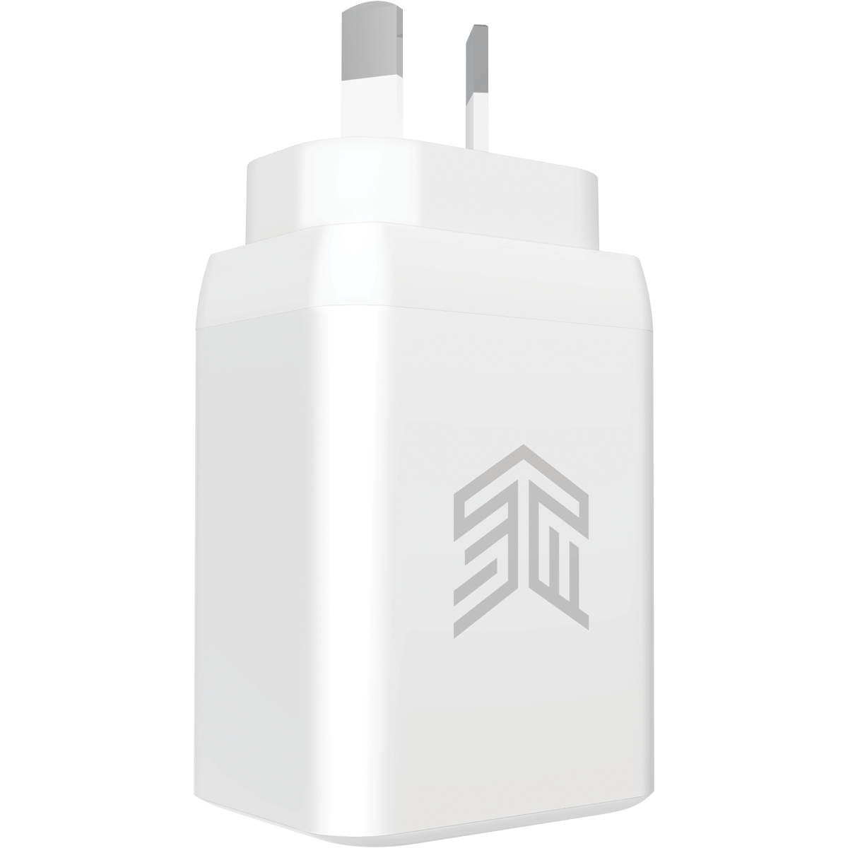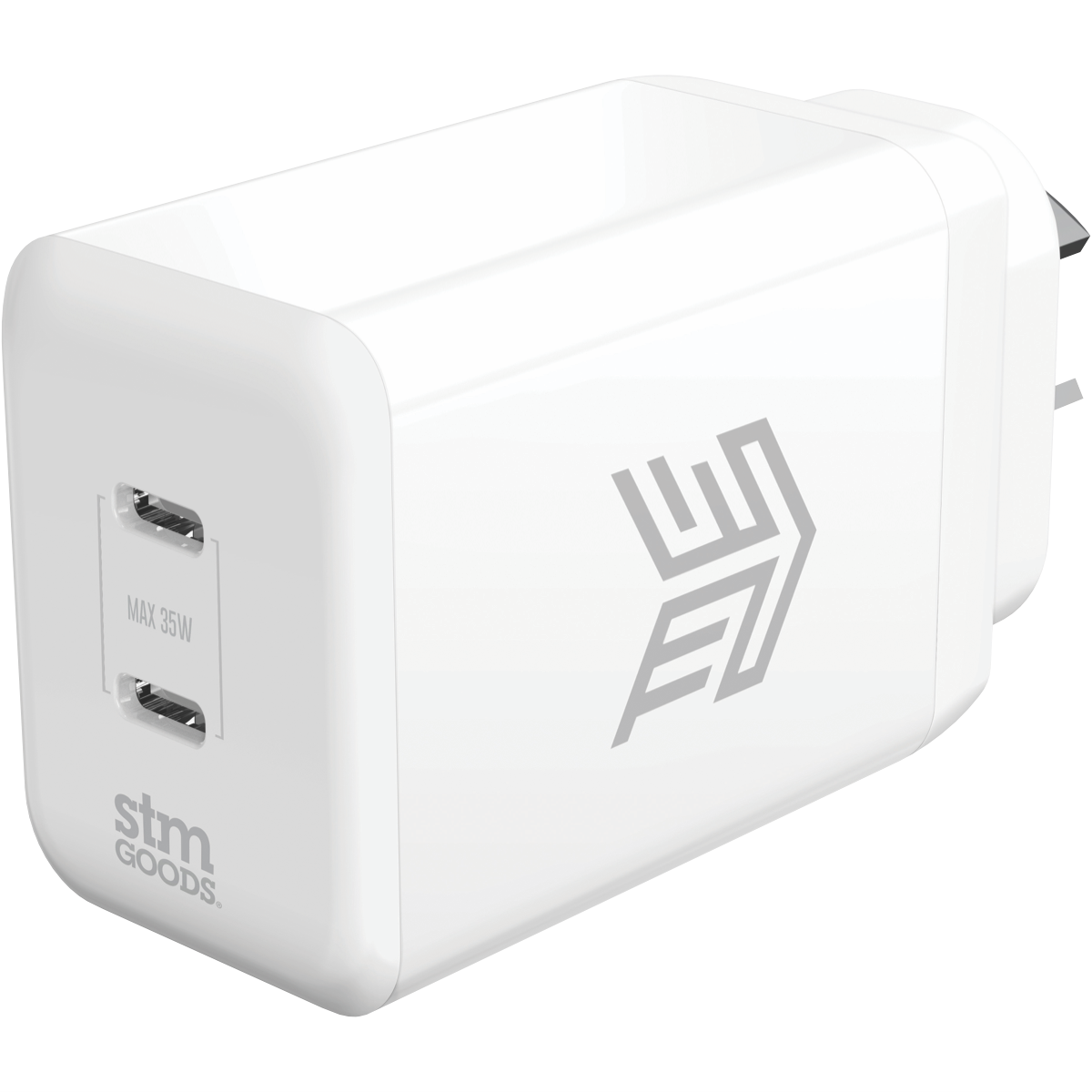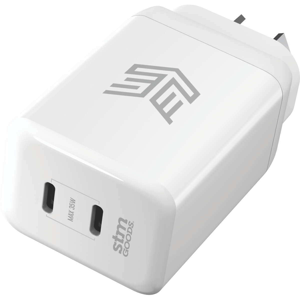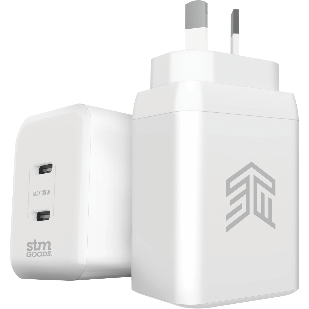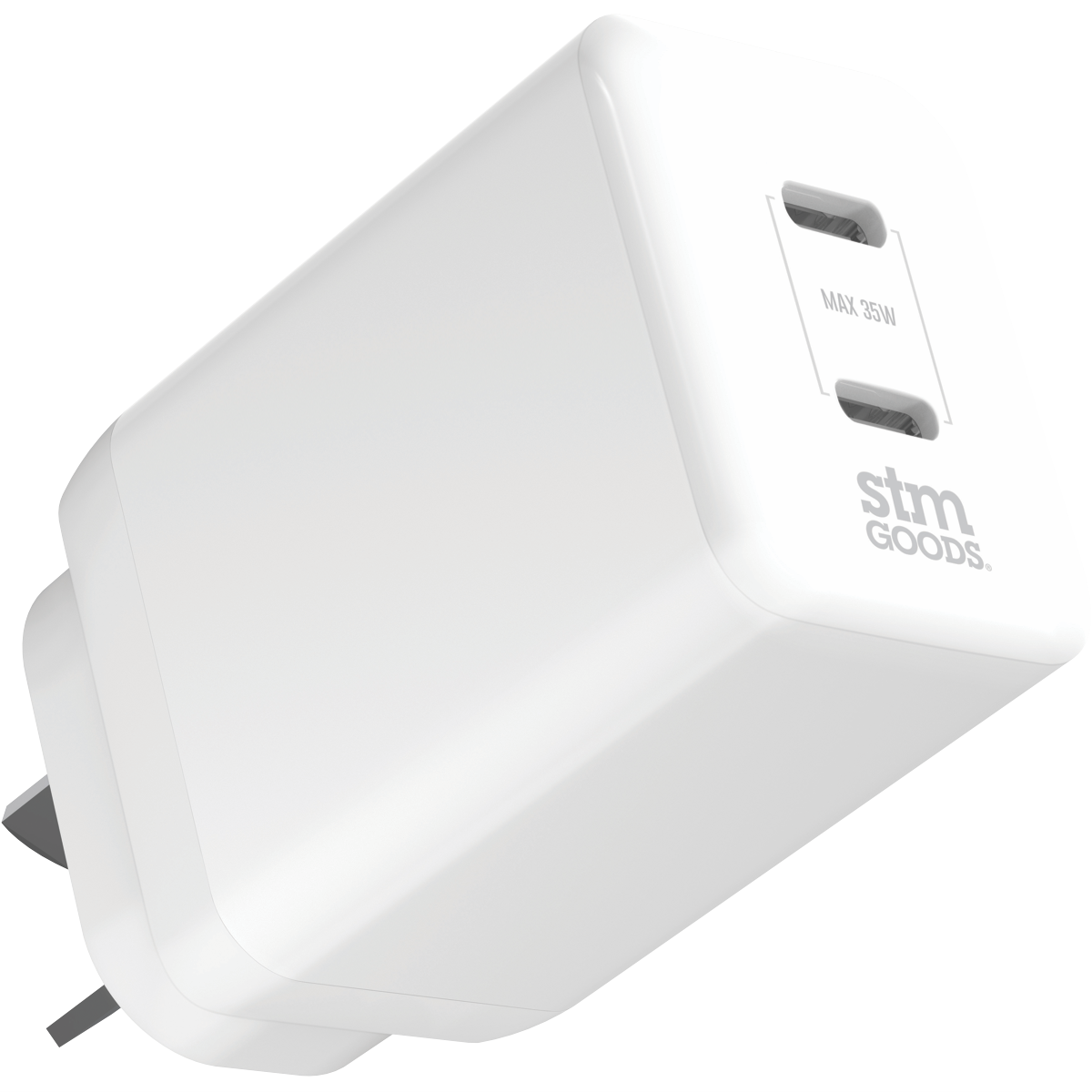 Power up and charge on the go with the STM 35W Dual Port USB-C & USB-C charger. This sleek white charger packs a punch delivering 35W of power across dual USB-C ports to juice up your devices. Simply plug your phone tablet or laptop into either superfast port and power back up in no time. With a max output of 3A it charges compatible devices up to 2.5x faster than standard 5W chargers. Whether you're charging two phones at once or powering your laptop solo it has the versatility to suit your needs. And weighing just 79g its compact size slips easily into your bag or pocket for charging wherever you roam. With a 2 year manufacturer's warranty providing peace of mind experience the speed and convenience of simultaneous fast charging for all your devices with the STM 35W Dual Port USB-C & USB-C charger. The manufacturer's part number for this product is 5568525. Check it out today for high-powered charging on the move.