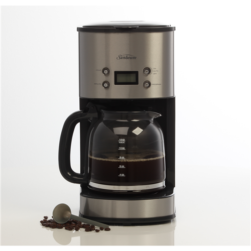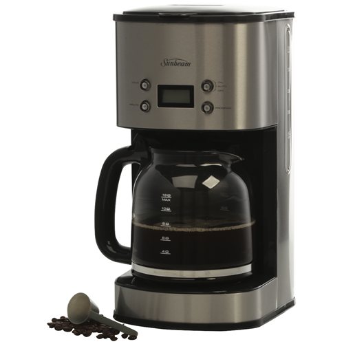 Enjoy fresh delicious coffee every morning with the Sunbeam 12 Cup Drip Filter Coffee Machine. This stainless steel coffee maker brews up to 12 cups of coffee at a time perfect for gatherings with family and friends or keeping the whole office energized. The programmable timer allows you to wake up to the inviting aroma of freshly brewed coffee. Simply add water and ground coffee into the machine the night before set the timer and a hot pot will be ready when you wake. The shower head evenly distributes water over the coffee grounds for optimal flavor extraction. The keep warm plate ensures your coffee stays hot for up to 2 hours after brewing completes. The removable filter basket and glass carafe make cleanup quick and easy. Brew coffee just the way you like with the strength selector dial. This drip coffee machine's compact footprint saves precious counter space in your kitchen. Experience the convenience of hot tasty coffee anytime with the Sunbeam 12 Cup Drip Filter Coffee Machine. The manufacturer's part number for this product is PC7900. Check out this coffee maker to start your mornings right.