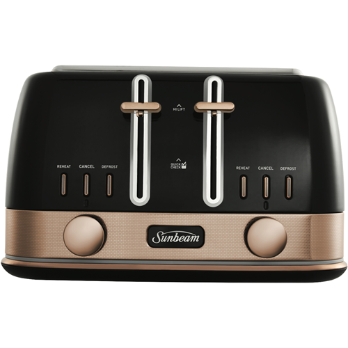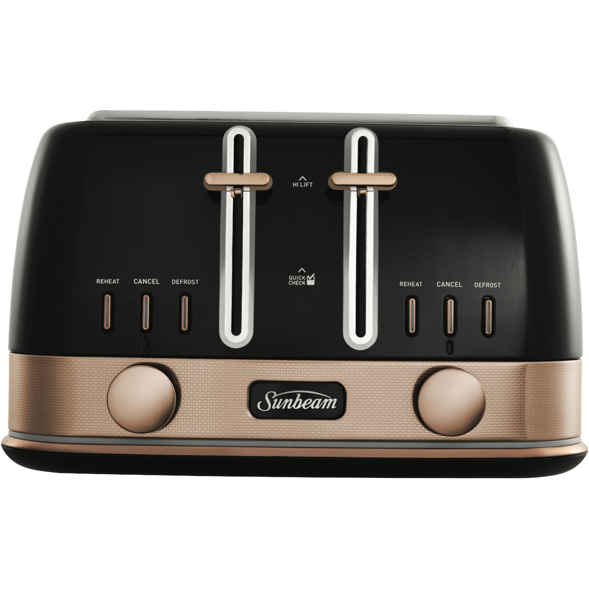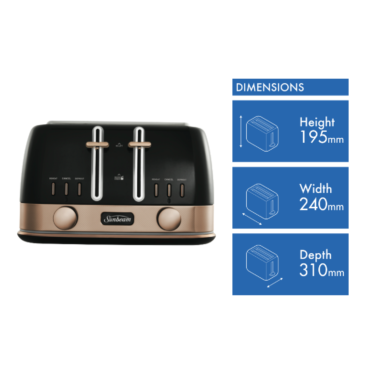 Elevate your breakfast routine with the Sunbeam 4 Slice New York Toaster. With its sleek black and bronze exterior this 1950W toaster will look stylish on any kitchen countertop. Toast up to 4 slices of bread at a time with variable browning control to get your toast just the way you like it. The high lift lever allows for safe removal of smaller items like crumpets or English muffins. Defrost and reheat functions provide flexibility when preparing frozen foods. The removable crumb tray makes cleanup easy. With a cancel button to halt toasting mid-cycle you're in complete control. Sunbeam's 1 year warranty provides peace of mind. This New York Collection toaster measures 195mm high x 240mm wide x 310mm deep and weighs 2.4kg. Its convenient features and reliable performance make meal prep simple. Give your mornings an upgrade with the Sunbeam 4 slice toaster. The manufacturer's part number for this product is TA4440KB. Add it to your cart today for convenient breakfasts and beyond.