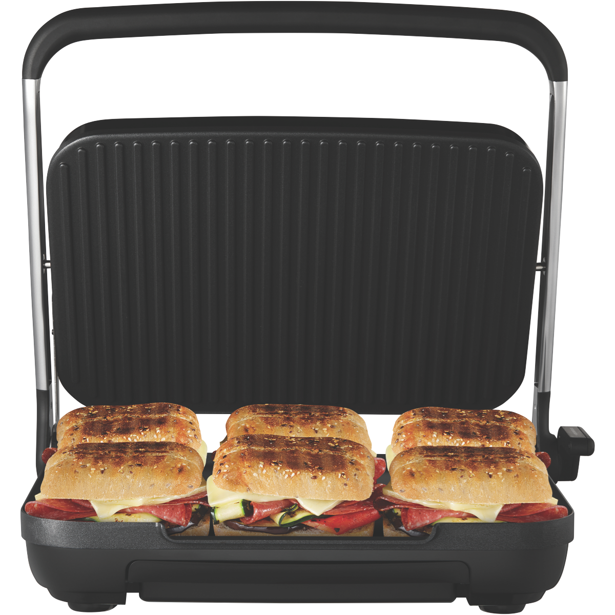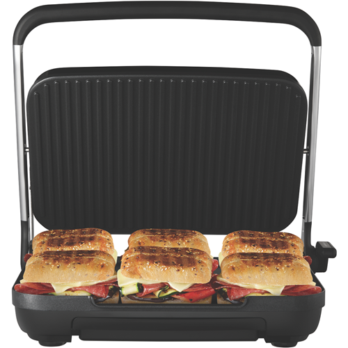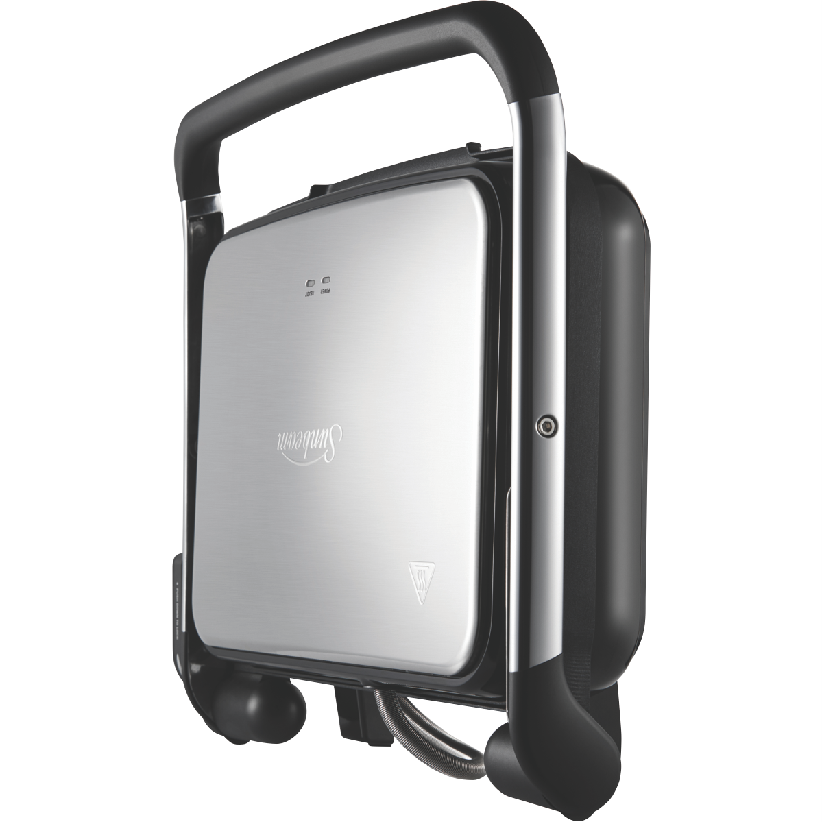 Grill up to 6 sandwiches at once with the Sunbeam 6 Slice Sandwich Grill and Press. This stainless steel grill features 2400W of power to heat the ribbed top and flat bottom non-stick grill plates in just 2 minutes. The grill plates evenly distribute heat across the 376 x 284mm cooking surface to ensure perfect results every time. With cool touch handles indicator lights and a handy cord wrap this sandwich press makes grilling fast and easy. The built-in drip tray catches any excess oils or fat for effortless cleanup. Grill steaks panini quesadillas and more in just minutes. The 2 year warranty provides peace of mind with this quality grill. With even heat distribution non-stick plates and convenient cord storage the Sunbeam Sandwich Grill streamlines meal preparation. The manufacturer's part number for this product is GRM7000SS. Check out the Sunbeam 6 Slice Sandwich Grill and Press today.