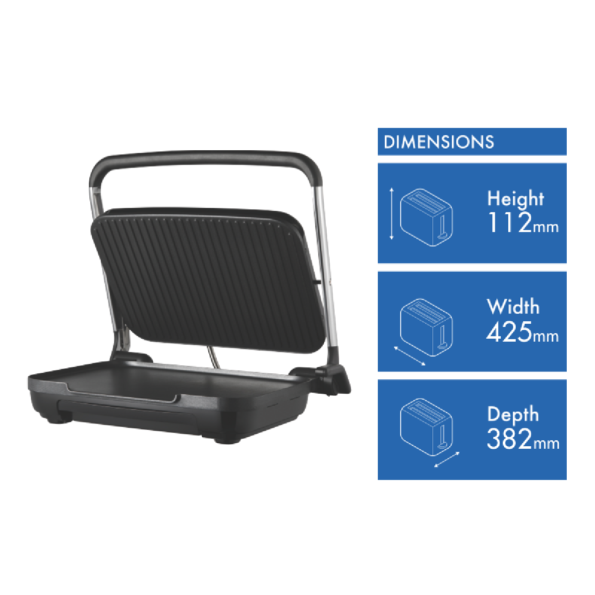 Additional Features AnyHeight Controlâ„¢ Lever, Even heat distribution, Heats up in 2 minutes, Cooks steaks from as little as 3 minutes, Curved lip for easy crumb clean up, Built in cord wrap