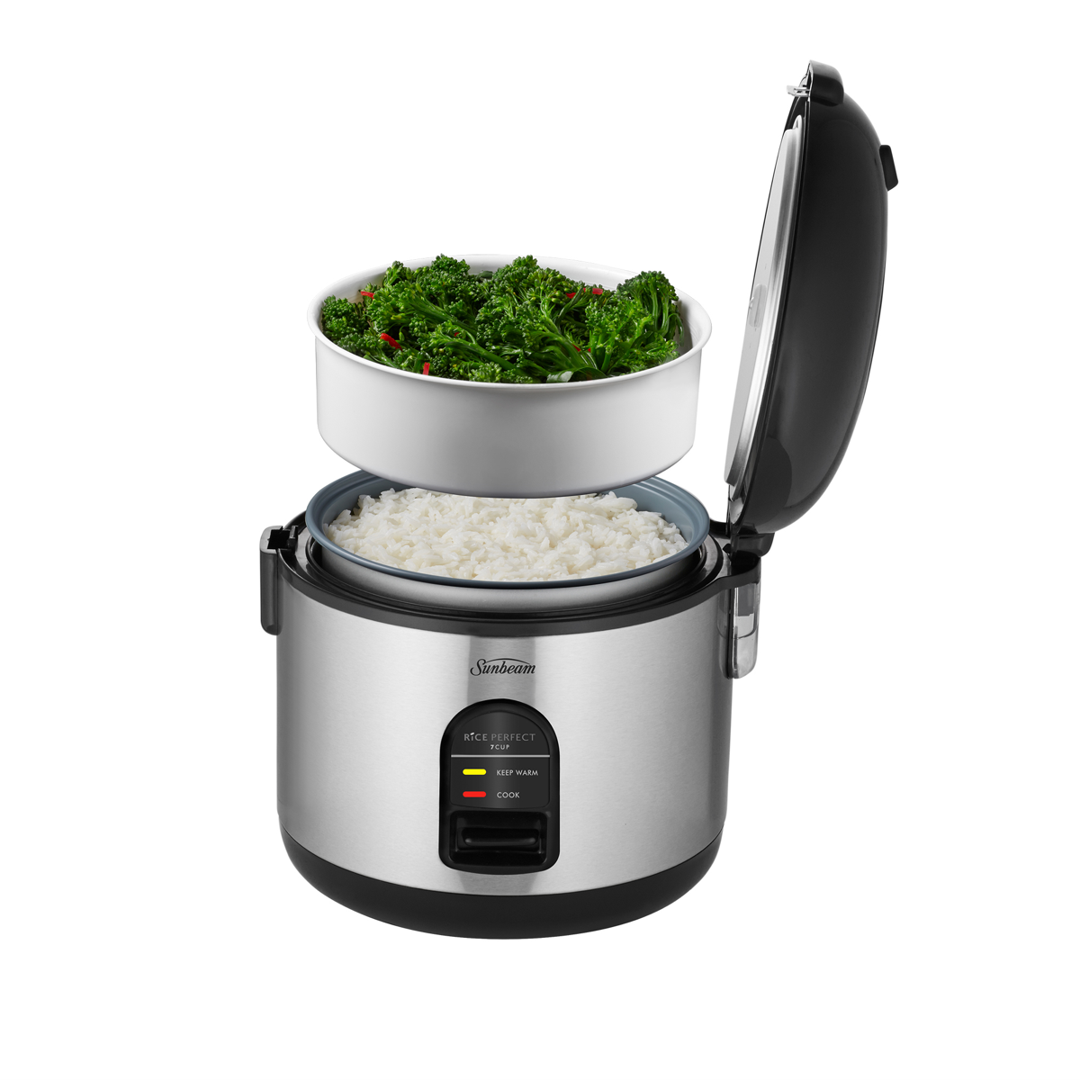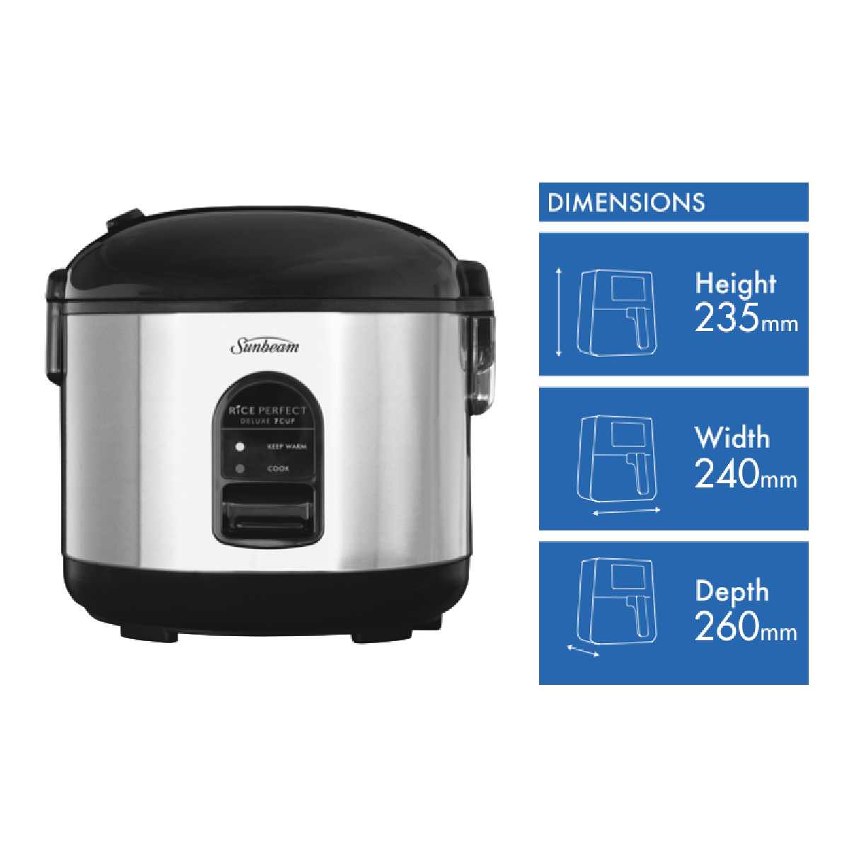 Craft the perfect rice every time with the Sunbeam 7 Cup Perfect Deluxe Rice Cooker. This versatile stainless steel appliance features a non-stick removable bowl for easy cleaning and sealed locking lid to trap in steam. With one-touch operation it cooks rice automatically then keeps it warm until you're ready to serve. The included steaming tray lets you steam veggies or fish alongside rice for a complete meal. Other highlights include the compact 240mm width to fit snugly on your countertop and durable construction backed by a 1 year warranty. Whether you love sushi rice basmati or jasmine this rice cooker's preset cooking programs take the guesswork out of getting fluffy delicious grains. The manufacturer's part number for this product is RC5600. Check out the Sunbeam Deluxe Rice Cooker for effortless everyday rice cooking today.