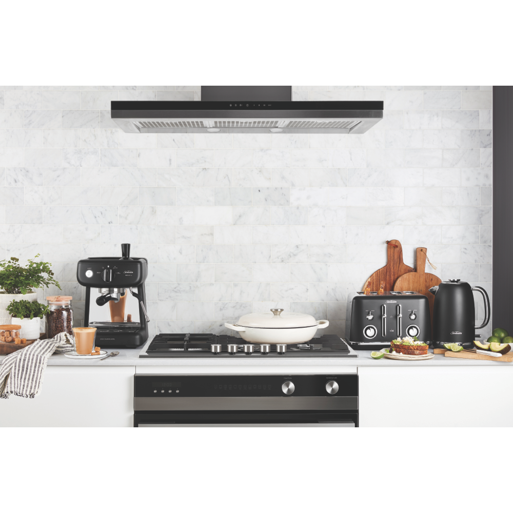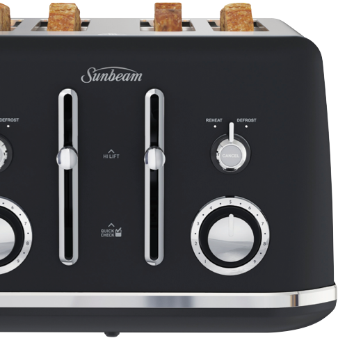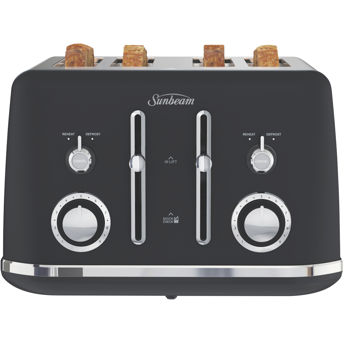 This Sunbeam Alinea Collection Toaster TA2740K features a 4-slice capacity in Sunbeam's Black Classics design for a pop of classic styling on your kitchen bench. It has variable browning control so you can set for light and golden or crispy brown as well as Defrost and Reheat settings. It also has high lift functionality including QuickCheck so you can monitor progress without interrupting toasting itself. The Sunbeam toaster's cord storage helps you maintain a neat bench. You can turn breakfast into a toast fest thanks to this black Sunbeam toaster.