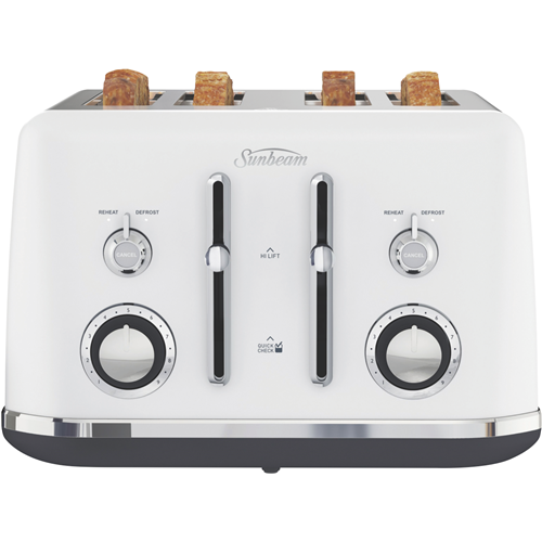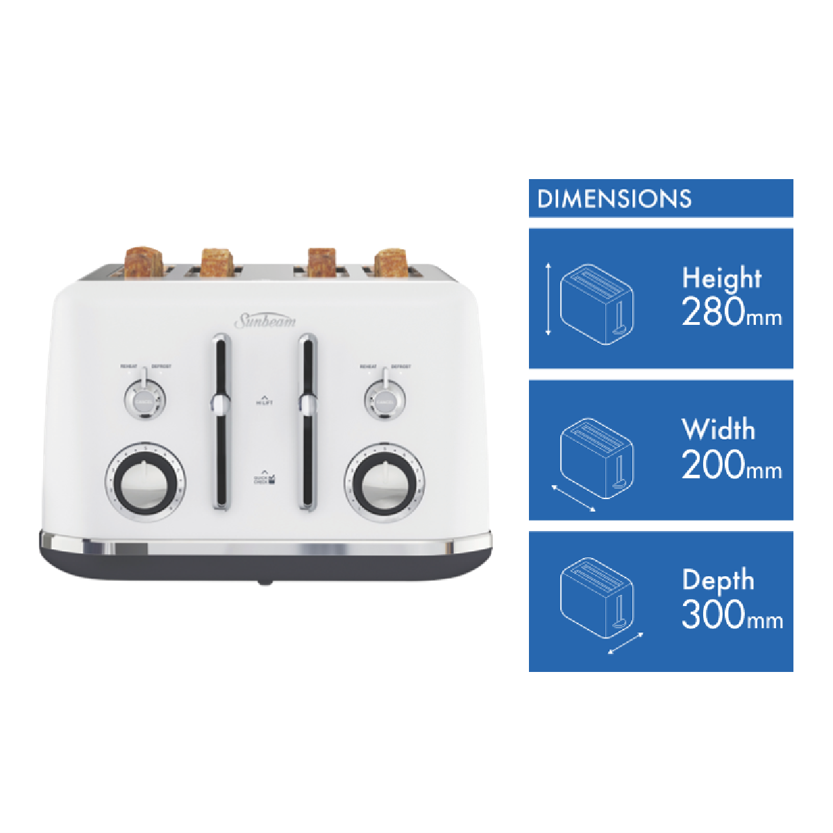With its sleek white design the Sunbeam Alinea Collection 4 Slice Toaster will be a stylish addition to any kitchen. This 1950 watt toaster features self-centring slots to ensure even toasting along with 9 browning settings for customized results. The removable crumb tray allows for easy cleaning while the high lift lever provides safe removal of toasted items. Additional useful functions include defrost reheat and Quick Check which enables monitoring of toasting progress without interrupting the cycle. Crafted with convenience in mind this toaster also boasts cord storage to minimize clutter on your countertop. The Sunbeam Alinea 4 slice toaster measures 280mm high by 200mm wide and 300mm deep with a total weight of 3.4kg. Backed by a 1 year manufacturer's warranty this quality toaster will meet all your breakfast needs for years to come. The manufacturer's part number for this product is TA2740W. Take your toast to the next level with this versatile 4 slice toaster from Sunbeam.